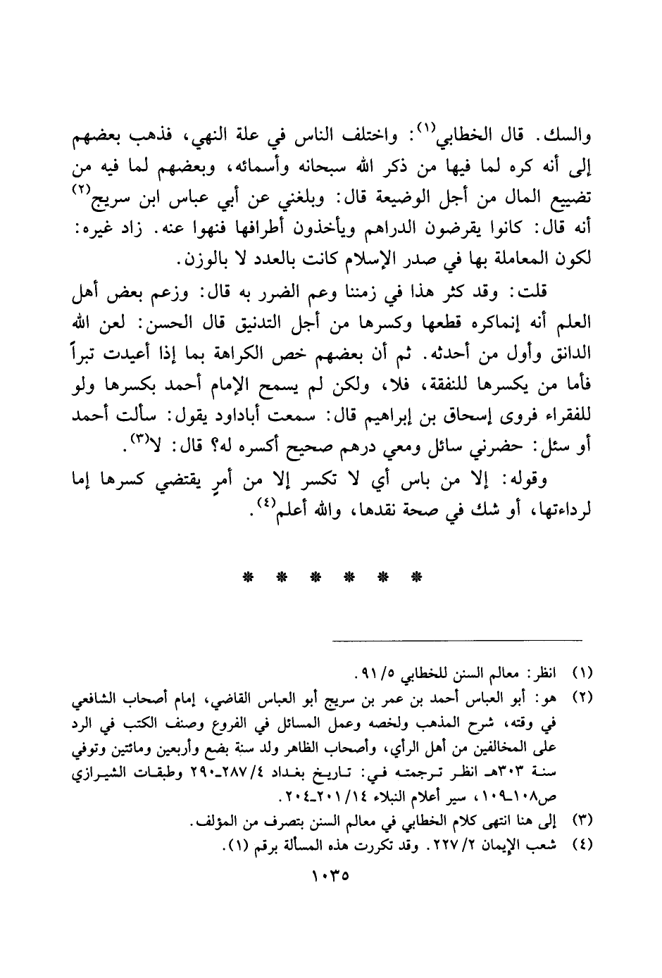 قلت: وقد كثر هذا في زمننا وعم الضرر به قال: وزعم بعض أهل العلم أنه إنما كره قطعها وكسرها من أجل التدنيق قال الحسن: لعن الله الدانق وأول من أحدثه. ثم أن بعضهم خص الكراهة بما إذا أعيدت تبرًا فأما من يكسرها للنفقة، فلا، ولكن لم يسمح الإمام أحمد بكسرها ولو للفقراء فروى إسحاق بن إبراهيم قال: سمعت أبا داود يقول: سألت أحمد أو سئل: حضرني سائل ومعي درهم صحيح أكسره له؟ قال: لا.