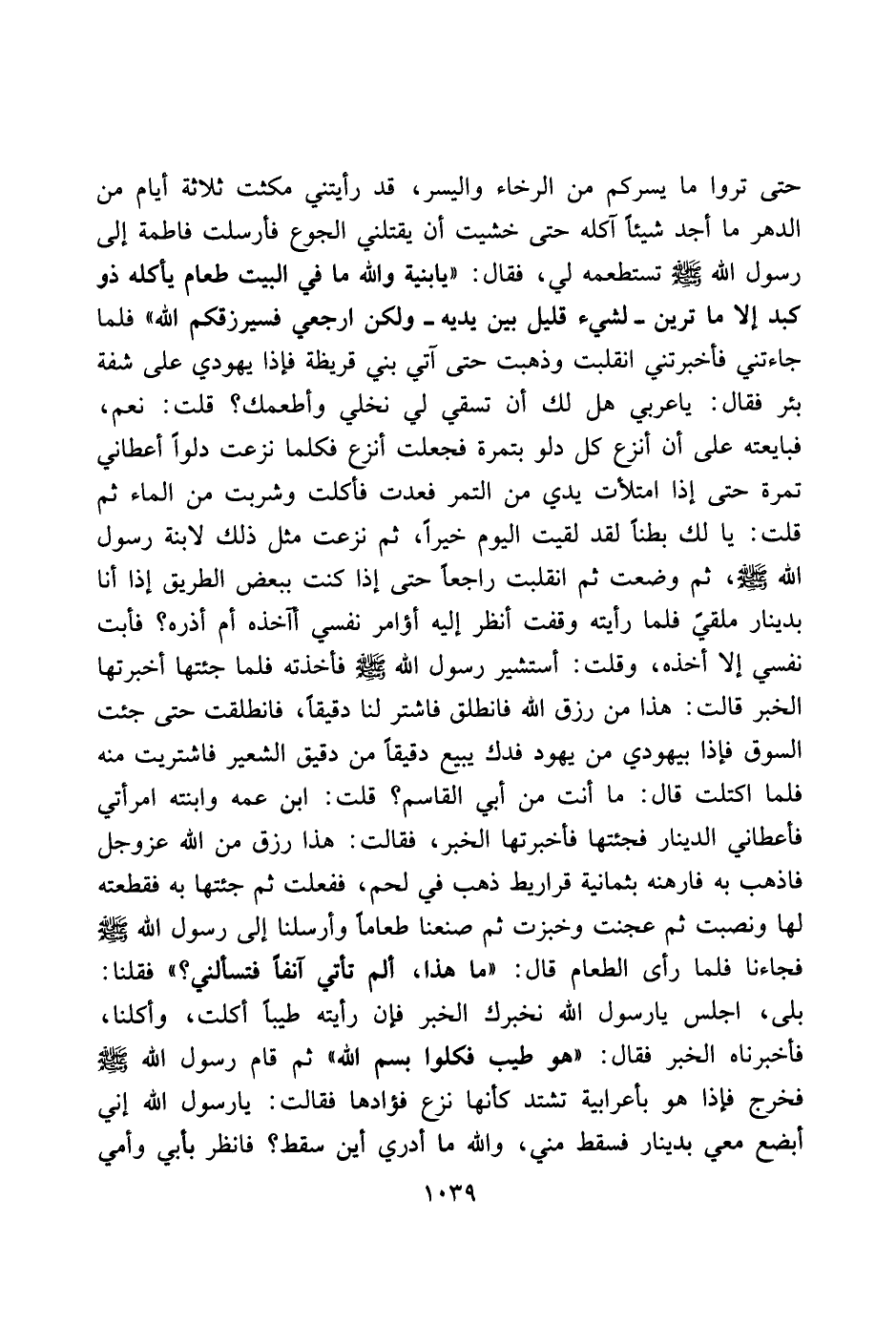 حتى تروا ما يسركم من الرخاء واليسر، قد رأيتني مكثت ثلاثة ايام من الدهر ما أجد شيئًا آكله حتى خشيت أن يقتلني الجوع فأرسلت فاطمة إلى رسول الله صلى الله عليه وسلم تستطعمه لي، فقال: "يا بنية والله ما في البيت طعام يأكله ذو كبد إلا ما ترين ـ لشيء قليل بين يديه ـ ولكن ارجعي فسيرزقكم الله" فلما جاءتني فأخبرتني انقلبت وذهبت حتى آتي بني قريظة فإذا يهودي على شفة بئر فقال: يا عربي هل لك أن تسقي لي نخلي وأطعمك؟ قلت: نعم، فبايعته على أن أنزع كل دلو بتمرة فجعلت أنزع فكلما نزعت دلوًا أعطاني تمرة حتى إذا امتلأت يدي من التمر فعدت فأكلت وشربت من الماء ثم قلت: يا لك بطنًا لقد لقيت اليوم خيرًا، ثم نزعت مثل ذلك لابنة رسول الله صلى الله عليه وسلم، ثم وضعت ثم انقلبت راجعًا حتى إذا كنت ببعض الطريق إذا أنا بدينار ملقي فملا رأيته وقفت أنظر إليه أؤامر نفسي أأخذه أم أذرة؟ فأبت نفسي إلا أخذه، وقلت: أستشير رسول الله صلى الله عليه وسلم فأخذته فلما جئتها أخبرتها الخبر قالت: هذا من رزق الله فانطلق فاشتر لنا دقيقًا، فانطلقت حتى جئت السوق فإذا بيهودي من يهود فدك يبيع دقيقًا من دقيق الشعير فاشتريت منه فلما اكتلت قال: ما أنت من أبي القاسم؟ قلت: ابن عمه وابنته امرأتي فأعطاني الدينار فجئتها فأخبرتها الخبر، فقالت: هذا رقز من الله عز وجل فاذهب به فارهنه بثمانية قراريط ذهب في لحم، ففعلت ثم جئتها به فقطعته لها ونصبت ثم عجنت وخبزت ثم صنعنا طعامًا وأرسلنا إلى رسول الله صلى الله عليه وسلم فجاءنا فلما رأى الطعام قال: "ما هذا، الم تأتي آنفًا فتسألني؟ " فقلنا: بلى، اجلس يا رسول الله نخبرك الخبر فإن رأيته طيبًا أكلت، وأكلنا، فأخبرناه الخبر فقال: "هو طيب فكلوا بسم الله" ثم قام رسول الله صلى الله عليه وسلم فخرج فإذا هو بأعرابية تشتد كأنها نزع فؤادها فقالت: يا رسول الله إني أبضع معي بدينار فسقط مني، والله ما أدري أين سقط؟ فانظر بأبي وأمي