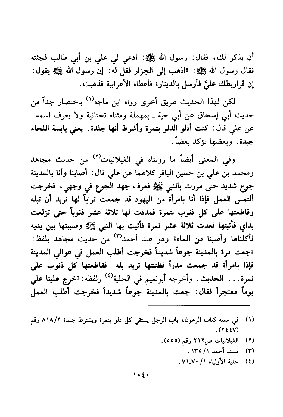 وفي المعنى أيضًا ما رويناه في الغيلانيات من حديث مجاهد ومحمد بن علي بن حسين الباقر كلاهما عن علي قال: أصابنا وأنا بالمدينة جوع شديد حتى مررت بالنبي صلى الله عليه وسلم فعرف جهد الجوع ي وجهي، فخرجت ألتمس العمل فإذا أنا بامرأة من اليهود قد جمعت ترابًا لها تريد أن تبله وقاطعتها على كل ذنوب بتمرة فمددت لها ثلاثة عشر ذنوبًا حتى تزلعت يداي فأتيتها فعدت ثلاثة عشر تمرة فاتيت بها النبي صلى الله عليه وسلم وصببتها بين يديه فأكلناها وأصبنا من الماء" وهو عند أحمد من حديث مجاهد بلفظ: "جعت مرة بالمدينة جوعًا شديدًا فخرجت أطلب العمل في عواملي المدينة فإذا بامرأة قد جمعت مدرًا فظننتها تريد بله فقاطعتها كل ذنوب على تمرة ... الحديث. وأخرجه أبو نعيم في الحلية ولفظه: "خرج علينا علي يومًا متعجزًا فقال: جعت بالمدينة جوعًا شديدًا فخرجت أطلب العمل