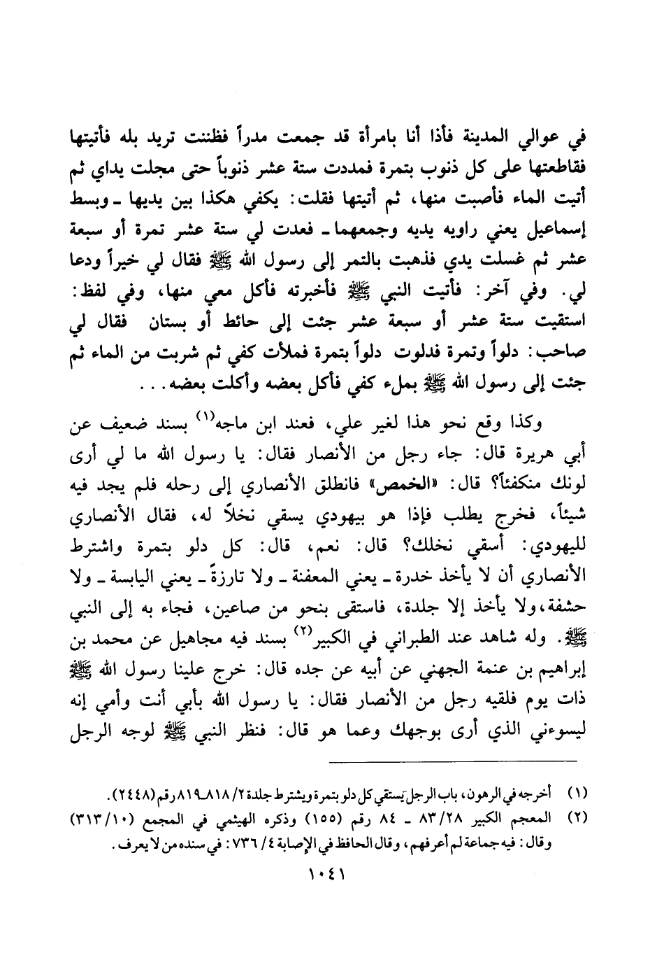 في عوالي المدينة فإذا أنا بامرأة قد جمعت مدرًا فظننت تريد بله فأتيتها فقاطعتها على كل ذنوب بتمرة فمددت ستة عشر ذنوبًا حتى مجلت يداي ثم أتيت الماء فأصبت منها، ثم أتيتها فقلت: يكفي هكذا بين يديها ـ وبسط إسماعل يعني روايه يديه وجمعها ـ فعدت لي ستة عشر تمرة أو سبعة عشر ثم غسلت يدي فذهبت بالتمر إلى رسول الله صلى الله عليه وسلم فقال لي خيرًا ودعا لي. وفي آخر: فأتيت النبي صلى الله عليه وسلم فأخبرته فأكل معي منها، وفي لفظ: استقيت ستة عشر أو سبعة عشر جئت إلى حائط أو بستان فقال لي صاحب: دلوًا وتمرة فدلوت دلوًا بتمرة فملأت كفي ثم شربت من الماء ثم جئت إلى رسول الله صلى الله عليه وسلم بملء كفي فأكل بعضه وأكلت بعضه ...