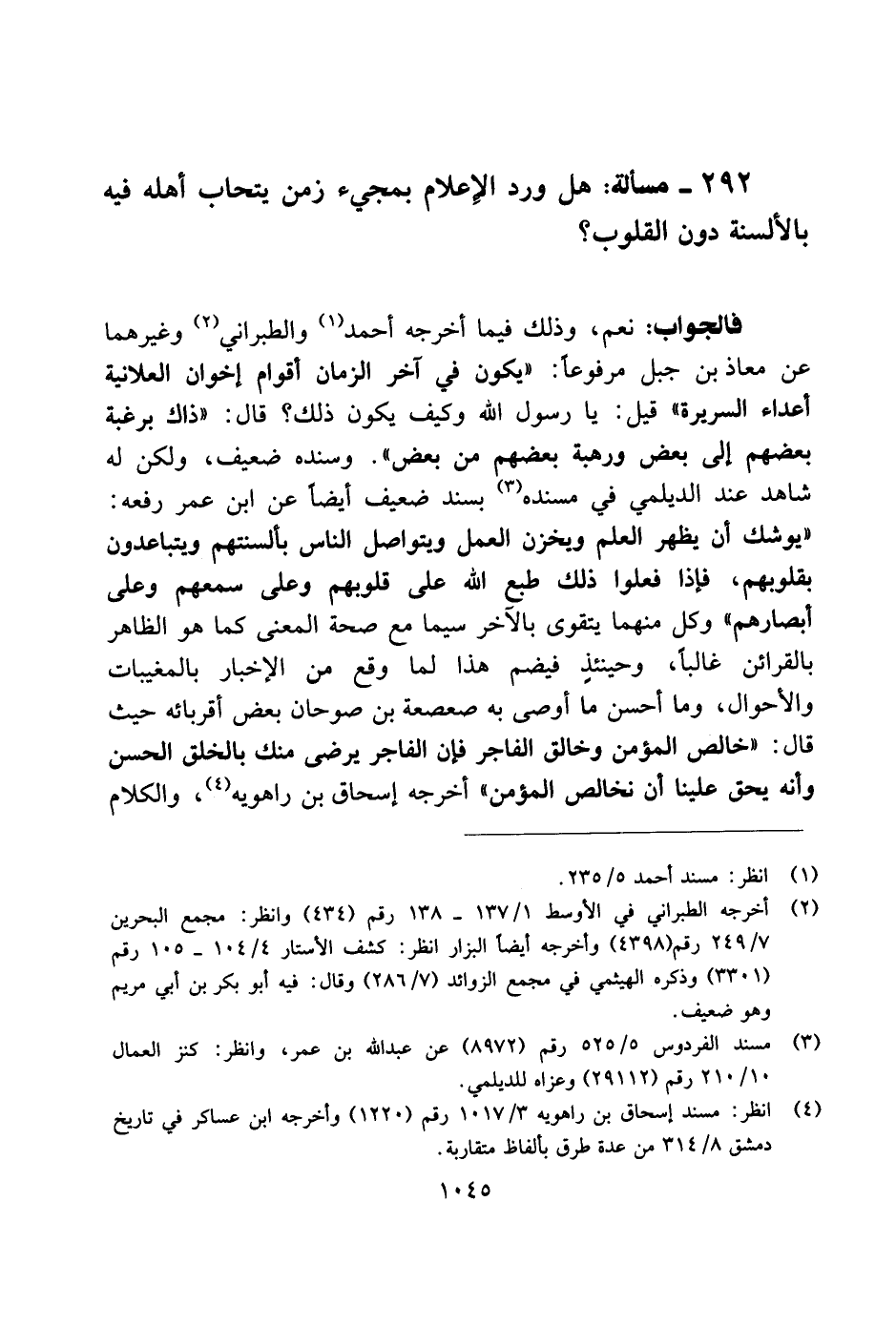 292 - مسألة: هل ورد الإعلام بمجيء زمن يتحاب أهله فيه بالألسنة دون القلوب؟
