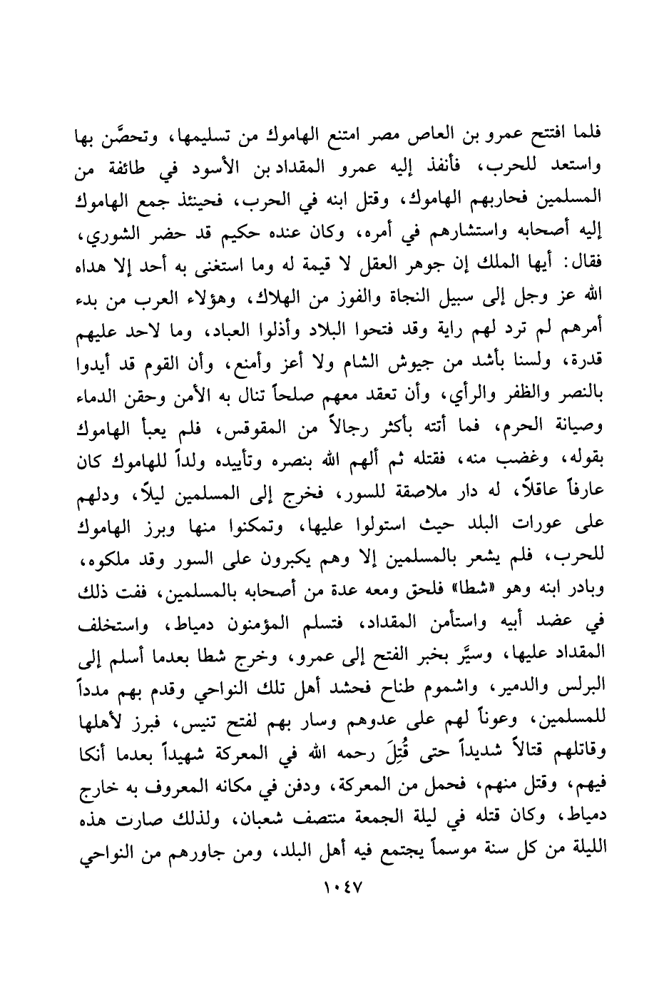 فلما افتتح عمرو بن العاص مصر امتنع الهاموك من تسليمها، وتحصن بها واستعد للحرب، فأنقذ إليه عمرو المقداد بن الأسود في طائفة من المسلمين فحاربهم الهاموك، وقتل ابنه في الحرب، فحينئذ جمع الهاموك إليه أصحاب واستشارهم في أمره، وكان عنده حكيم قد حضر الشورى، فقال: أيها الملك إن جوهر العقل لا قيمة له وما استغنى به أحد إلا هداه الله عز وجل إلى سبيل النجاة والفوز من الهلاك، وهؤلاء العرب من بدء أمرهم لم ترد لهم راية وقد فتحوا البلاد وأذلوا العباد، وما لأحد عليهم قدرة، ولسنا بأشد من جيوش الشام ولا أعز وأمنع، وأن القوم قد أيدوا بالنصر والظفر والرأي، وأن تعقد معهم صلحًا تنال به الأمن وحقن الدماء وصيانة الحرم، فما أتته بأكثر رجالاً من المقوقس، فلم يعبأ الهاموك بقوله، وغضب منه، فقلته ثم ألهم الله بنصره وتأييده ولدًا للهاموك كان عارفًا عاقلاً، له دار ملاصة للسور، فخرج إلى المسلمين ليلاً، ودلهم على عورات البلد حيث استولوا عليها، وتمكنوا منها وبرز الهاموك للحرب، لم يشعر بالمسلمين إلا وهم بكبرون على السور وقد ملكوه، وبادر ابنه وهو "شطا" فلحق ومعه عدة من أصحابه بالمسلمين، فقت ذلك في عضد أبيه واستأمن المقداد، فتسلم المؤمنون دمياط، واستخلف المقداد عليها، وسير بخبر الفتح إلى عمرو، وخرج شطا بعدما أسلم إلى البرلس والدمي، واشموم طناح فحشد أهل تلك النواحي وقدم بهم مددًا للمسلمين، وعونًا لهم على عدوهم وسار بهم لفتح تنيس، فبرز لأهلها وقاتلهم قتالاً شديدًا حتى قُتِلَ رحمه الله في المعركة شهيدًا بعدما أنكا فيهم، وقتل منهم، فحمل من المعركة، ودفن في مكانه المعروف به خارج دمياط، وكان قتله في ليلة الجمعة منتصف شعبان، ولذلك صارت هذه الليلة من كل سنة موسمًا يجتمع فيه أهل البلد، ومن جاورهم من النواحي