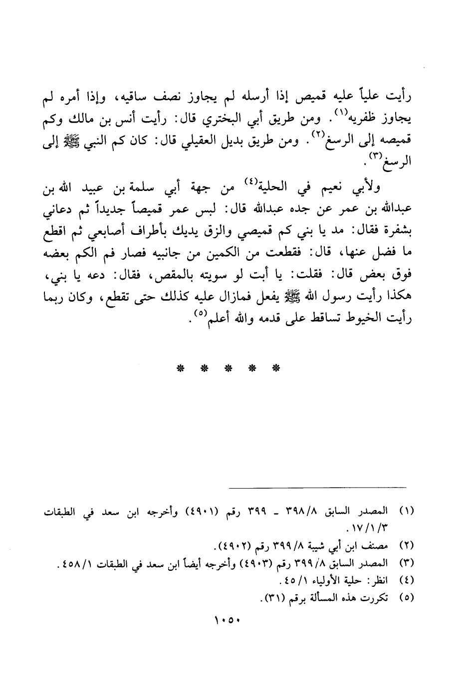 رأيت عليًا عليه قميص إذا أرسله لم يجاوز نصف ساقيه، وإذا أمره لم يجاوز ظفريه. ومن طيق أبي البختري قال: رأيت أنس بن مالك وكم قميصه إلى الرسغ. ومن طريق بديل العقيلي قال: كان كم النبي صلى الله عليه وسلم إلى الرسغ.