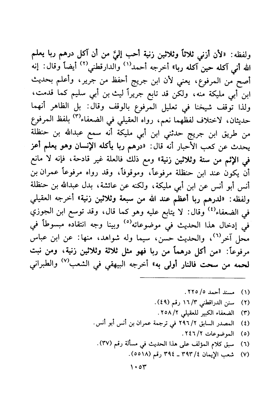 ولفظه: "لأن أزني ثلاثًا وثلاثين زنية أحب إليَّ من أن آكل درهم ربا يعلم الله أني آكله حين آكله ربا" أخرجه أحمد والدارقطني أيضًا وقال: إنه أصح من المرفوع، يعني لأن ابن جريج أحفظ من جرير، وأعلم بحديث ابن أبي مليكة منه، ولكن قد تابع جريرًا ليث بن أبي سليم كما قدمت، ولذا توقف شيخنا في تعليل المرفوع بالوقف وقال: بل الظاهر أنهما حديثان، لاختلاف لفظهما نعم، رواه العقيلي في الضعفاء بلفظ المرفوع من طريق ابن جريج حدثني ابن أبي مليكة أنه سمع عبد الله بن حنظلة يحدث عن كعب الأحبار أنه قال: "درهم ربا يأكله الإنسان وهو يعلم أعز في الإثم من ستة وثلاثين زنية" ومع ذلك فالعلة غير قادحة، فإنه لا مانع أن يكون عند ابن حنظلة مرفوعًا، وموقوفًا، وقد رواه مرفوعًا عمران بن أنس أبو أنس عن ابن ابي مليكة، ولكنه عن عائشة، بدل عبد الله بن حنظلة ولفظه: "لدرهم ربا أعظم عند الله من سبعة وثلاثين زنية" أخرجه العقيلي في الضعفاء وقال: لا يتابع عليه وهو كما قال، وقد توسع ابن الجوزي في إدخال هذا الحديث في موضوعاته وبينا وجه انتقاده مبسوطًا في محل آخر، والحديث حسن، سيما وله شواهد، منها: عن ابن عباس مرفوعًا: "من أكل درهمًا من ربا فهو مثل ثلاثة وثلاثين زنية، ومن نبت لحمه من سحت فالنار أولى به" أخرجه البيهقي في الشعب والطبراني
