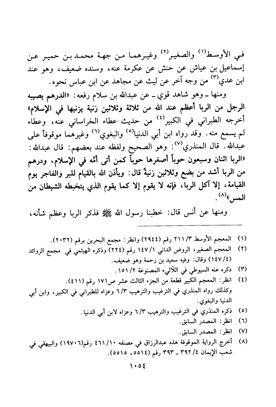 ومنها ـ وهو شاهد قوي ـ عن عبد الله بن سلام رفعه: "الدرهم يصيبه الرجل من الربا أعظم عند الله من ثلاثة وثلاثين زنية يزنيها في الإسلام" أخرجه الطبراني في الكبير من حديث عطاء الخراساني عنه، وعطاء لم يسمع منه. وقد رواه ابن أبي الدنيا والبغوي وغيرهما موقوفًا على عبد الله. قال المنذري: وهو الصحيح ولفظه عند بعضهم: قال عبد الله: "الربا اثنان وسبعون حوبًا أصغرها حوبًا كمن أتى أمه في الإسلام، ودرهم من الربا أشد من بضع وثلاثين زنية قال: ويأذن الله بالقيام للبر والفاجر يوم القيامة، إلا آكل الربا، فإنه لا يقوم إلا كما يقوم الذي يتخبطه الشيطان من المس".