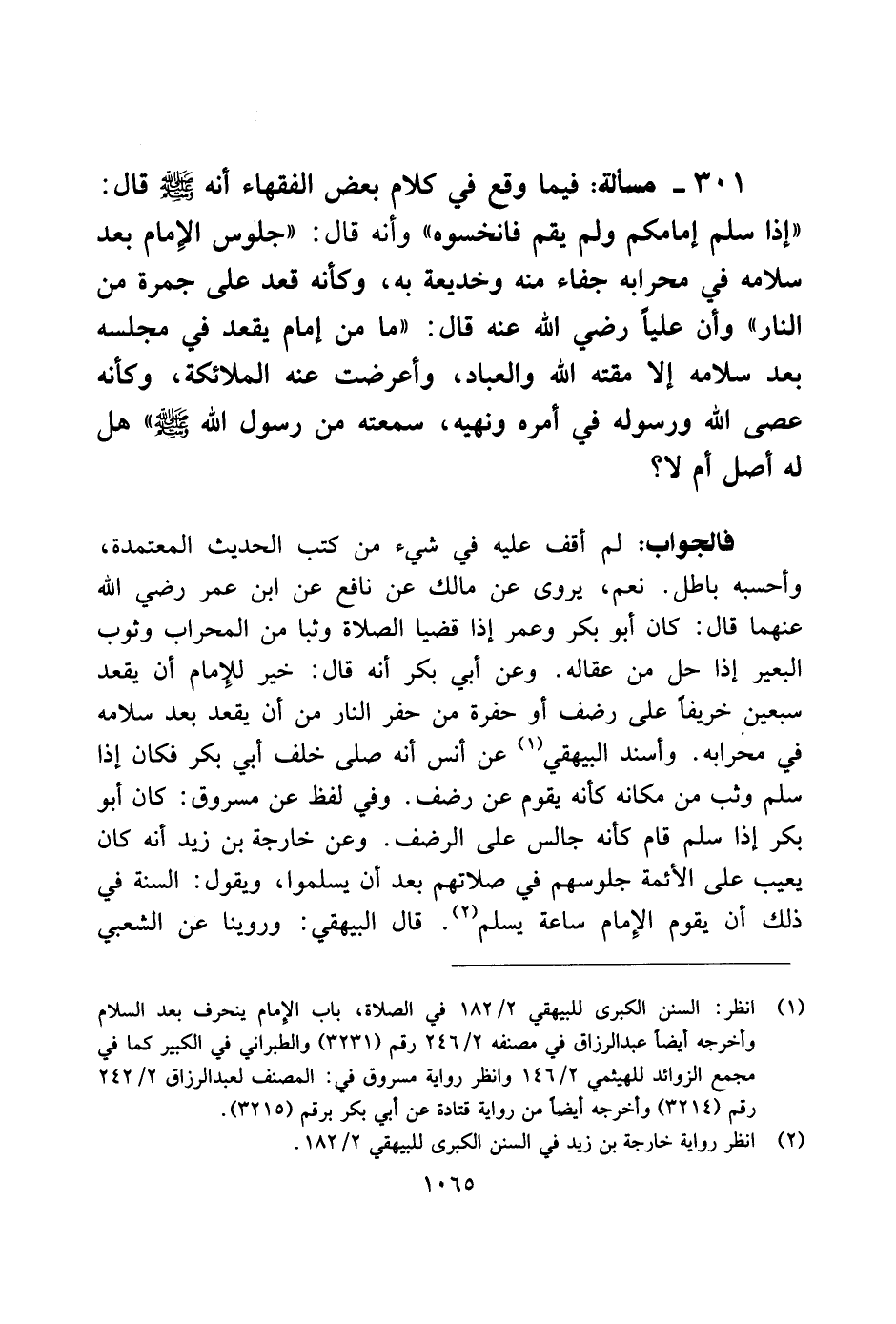 301 - مسألة: فيما وقع في كلام بعض الفقهاء أنه صلى الله عليه وسلم قال: "إذا سلم إمامكم ولم يقم فانخسوه" وأنه قال: "جلوس الإمام بعد سلامه في محرابه جفاء منه وخديعة به، وكأنه قعد على جمرة من النار" وأن عليًا رضي الله عنه قال: "ما من إمام يقعد في مجلسه بعد سلامه إلا مقته الله والعباد، وأعرضت عنه الملائكة، وكأنه عصى الله ورسوله في أمره ونهيه، سمعته من رسول الله صلى الله عليه وسلم" هل له أصل أم لا؟
