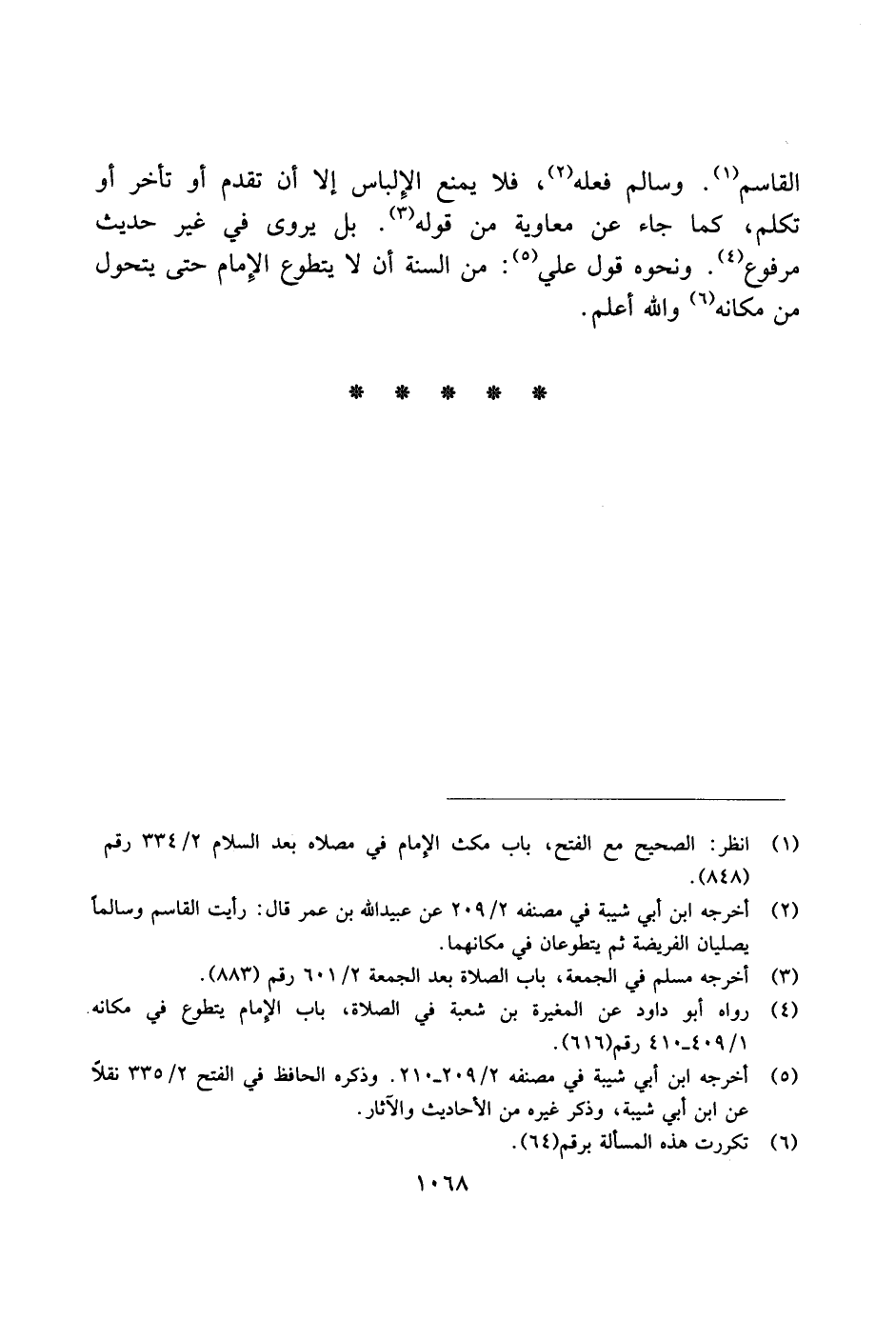 القاسم. وسالم فعله، فلا يمنع الإلباس إلا أن تقدم أو تأخر أو تكلم، كما جاء عن معاوية من قوله. بل يروى في غير حديث مرفوع. ونحوه قول علي: من السنة أن لا يتطوع الإمام حتى يتحول من مكانه والله أعلم.