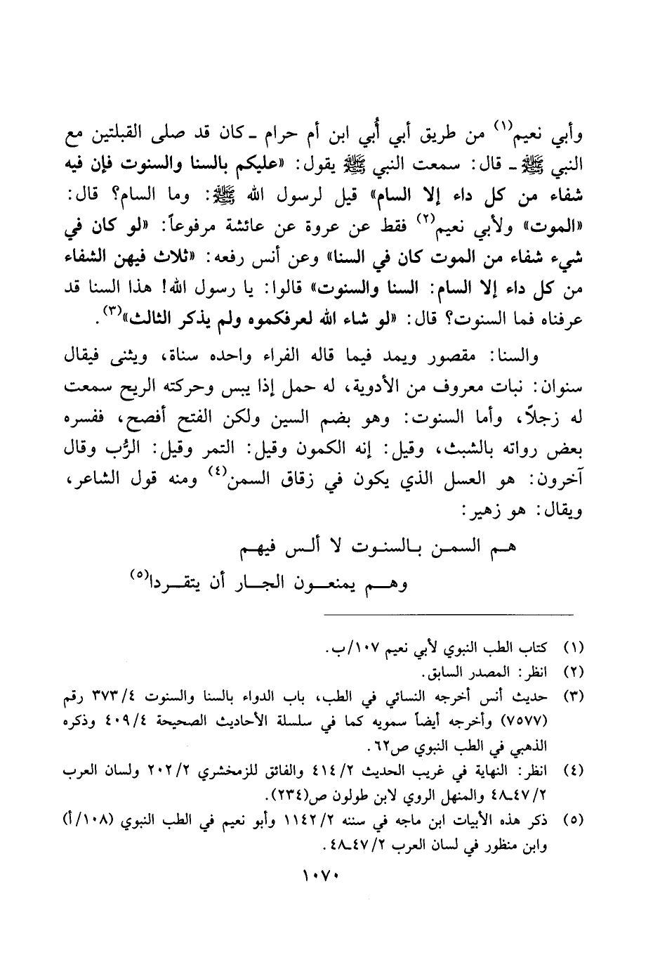 وأبي نعيم من طريق أبي أُبي ابن أم حرام ـ كان قد صلى القبلتين مع النبي صلى الله عليه وسلم ـ قال: سمعت النبي صلى الله عليه وسلم يقول: "عليكم بالسنا والسنوات فإن فيه شفاء من كل داء إلا السام" قيل لرسول الله صلى الله عليه وسلم: وما السام؟ قال: "الموت" ولأبي نعيم فقد عن عروة عن عائشة مرفوعًا: "لو كان في شيء شفاء من الموت كان في السنا" وعن أنس رفعه: "ثلاث فيهن الشفاء من كل داء إلا السام: السنا والسنوات" قالوا: يا رسول الله! هذا لسنا قد عرفناه فما السنوات؟ قال: "لو شاء الله لعرفكموه ولم يذكر الثالث".