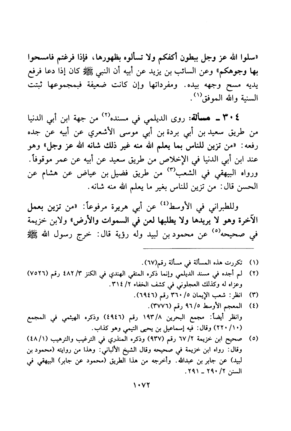 304 - مسالة: روى الديلمي في مسنده من جهة ابن أبي الدنيا من طريق سعيد بن أبي بردة بن أبي موسى الأشعري عن أبيه عن جده رفعه: "من تزين للناس بما يعلم الله منه غير ذلك شأنه الله عز وجل" وهو عند ابن أبي الدنيا في الإخلاص من طريق سعيد عن أبيه عن عمر موقوفًا. ورواه البيهقي في الشعب من طريق فضيل بن عياض عن هشام عن الحسن قال: من تزين للناس بغير ما يعلم الله منه شانه.