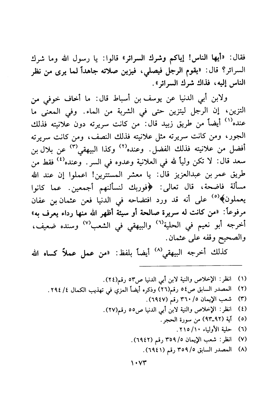 فقال: "أيها الناس! إياكم وشرك السرائر" قالوا: يا رسول الله وما شرك السرائر؟ قال: "يقوم الرجل فيصلي، فيزين صلاته جاهدًا لما يرى من نظر الناس إليه، فذاك شرك السرائر".