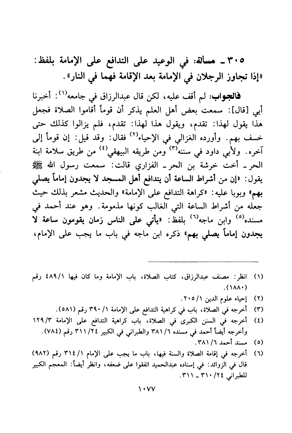 305 - مسألة: في الوعيد على التدافع على الإمامة بلفظ: "إذا تجاوز الرجلان في الإمامة بعد الإقامة فهما في النار".