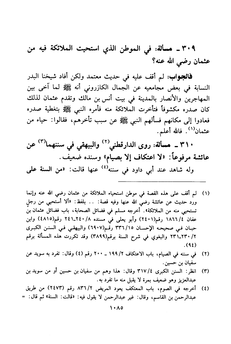 310 - مسألة: روى الدارقطني والبيهقي في سننهما عن عائشة مرفوعًا: "لا اعتكاف إلا بصيام" وسنده ضعيف.