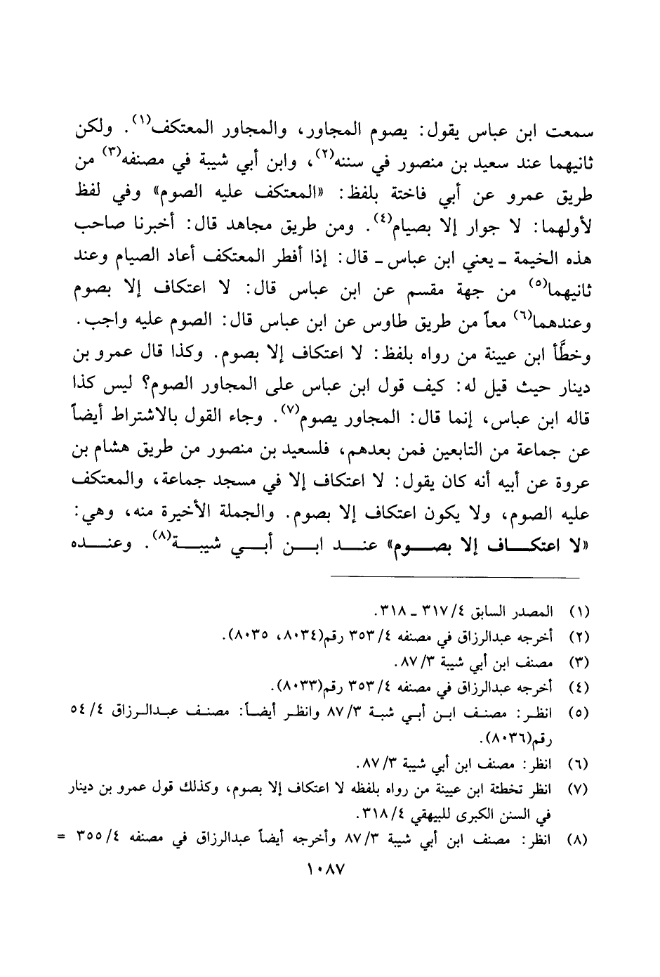 سمعت ابن عباس يقول: يصوم المجاور، والمجاور المعتكف. ولكن ثانيهما عند سعيد بن منصور في سننه، وابن أبي شيبة في مصنفه من طريق عمرو عن أبي فاختة بلفظ: "المعتكف عليه الصوم" وفي لفظ لأولهما: لا جوار إلا بصيام. ومن طريق مجاهد قال: أخبرنا صاحب هذه الخيمة ـ يعني ابن عباس ـ قال: إذا أفطر المعتكف أعاد الصيام وعند ثانيهما من جهة مقسم عن ابن عباس قال: لا اعتكاف إلا بصوم وعندهما معًا من طريق طاوس عن ابن عباس قال: الصوم عليه واجب. وخطأ ابن عيينة من رواه بلفظ: لا اعتكاف إلا بصوم. وكذا قال عمرو بن دينار حيث قيل له: كيف قول ابن عباس على المجاورم الصوم؟ ليس كذا قاله ابن عباس، إنما قال: المجاوريصوم, وجاء القول بالاشتراك أيضًا عن جماعة من التابعين فمن بعدهم، فلسعيد بن منصور من طريق هشام بن عروة عن أبيه أنه كان يقول: لا اعتكاف إلا في مسجد جماعة، والمعتكف عليه الصوم، ولا يكون اعتكاف إلا بصوم. وبالجملة الأخيرة منه، وهي: " لا اعتكاف إلا بصوم" عند ابن أبي شيبة. وعنده