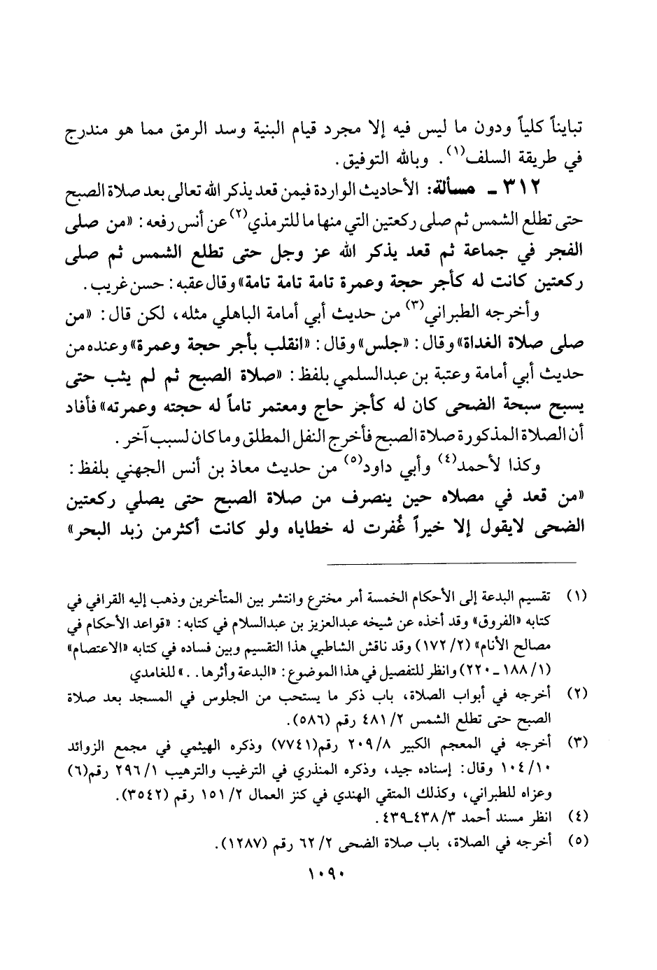 312 - مسألة: الأحاديث الواردة فيمن قعد يذكر الله تعالى بعد صلاة الصبح حتى تطلع الشمس ثم صلى ركعتين التي منها ما للترمذي عن أنس رفعه: "من صلى الفجر في جماعة ثم قعد يذكر الله عز وجل حتى تطلع الشمس ثم صلى ركعتين كانت له كأجر حجة وعمرة تامة تامة تامة" وقال عقبة: حسن غريب.