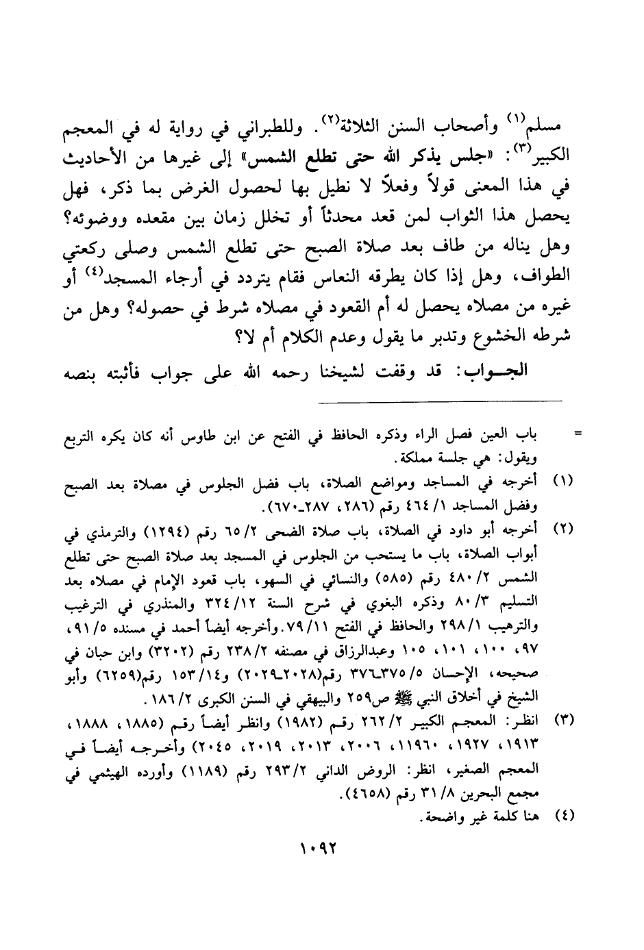 مسلم وأصحاب السنن الثلاثة. وللطبراني في رواية له في المعجم الكبير: "جلس يذكر الله حتى تطلع الشمس" إلى غيرها من الأحاديث في هذا المعنى قولاً وفعلاً لا نطيل بها لحصول الغرض بما ذكر، فهل يحصل هذا الثواب لمن قعد محدثًا أو تخلل زمان بين مقعده ووضوئه؟ وهل يناله من طاف بعد صلاة الصبح حتى تطلع الشمس وصلى ركعتي الطواف، وهل إذا كان يطرقه النعاس فقام يتردد في أرجاء المسجد أو غيره من مصلاه يحصل له أم القعود في مصلاه شرط في حصوله؟ وهل من شرط الخشوع وتدبر ما يقول وعدم الكلام أم لا؟