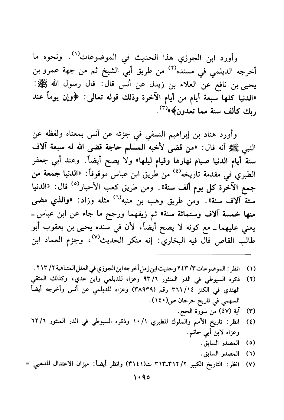 وأورد هناد بن إبراهيم النسفي في جزئه عن أنس بمعناه ولفظه عن النبي صلى الله عليه وسلم أنه قال: "من قضى لأخيه المسلم حاجة قضى الله له سبعة آلاف سنة أيام الدنيا صيام نهارك وقيام ليلها" ولا يصح أيضًا. وعند أبي جعفر الطبري في مقدمة تاريخه من طريق ابن عباس موقوفًا: "الدنيا جمعة من جمع الآخرة كل يوم ألف سنة". ومن طريق كعب الأحبار قال: "الدنيا ستة آلاف سنة". ومن طريق وهب بن منبه مثله وزاد: "والذي مضى منها خمسة آلاف وستمائة سنة" ثم زيفهما ورجح ما جاء عن ابن عباس ـ يعني عليهما ـ مع كونه لا يصح أيضًا، لأن في سنده يحيى بن يعقوب أبو طالب القاص قال فيه البخاري: إنه منكر الحديث، وجزم العماد ابن