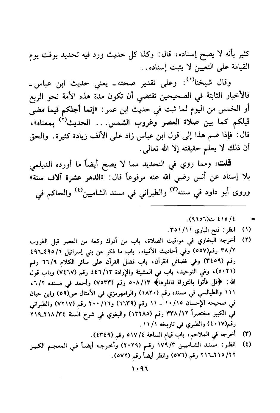 وقال شيخنا: وعلى تقدير صحته ـ يعني حديث ابن عباس ـ فالأخبار الثابتة في الصحيحين تقتضي أن يتكون مدة هذه الأمة نحو الربع أو الخمس من اليوم لما ثبت في حديث ابن عمر: "إنما أجلكم فيما مضى قبلكم كما بين صلاة العصر وغروب الشمس ... الحديث بمعناه"، قال: فإذا ضم هذا إلى قول ابن عباس زاد على الألف زيادة كثيرة. والحق أن ذلك لا يعلم حقيقته إلا الله تعالى.