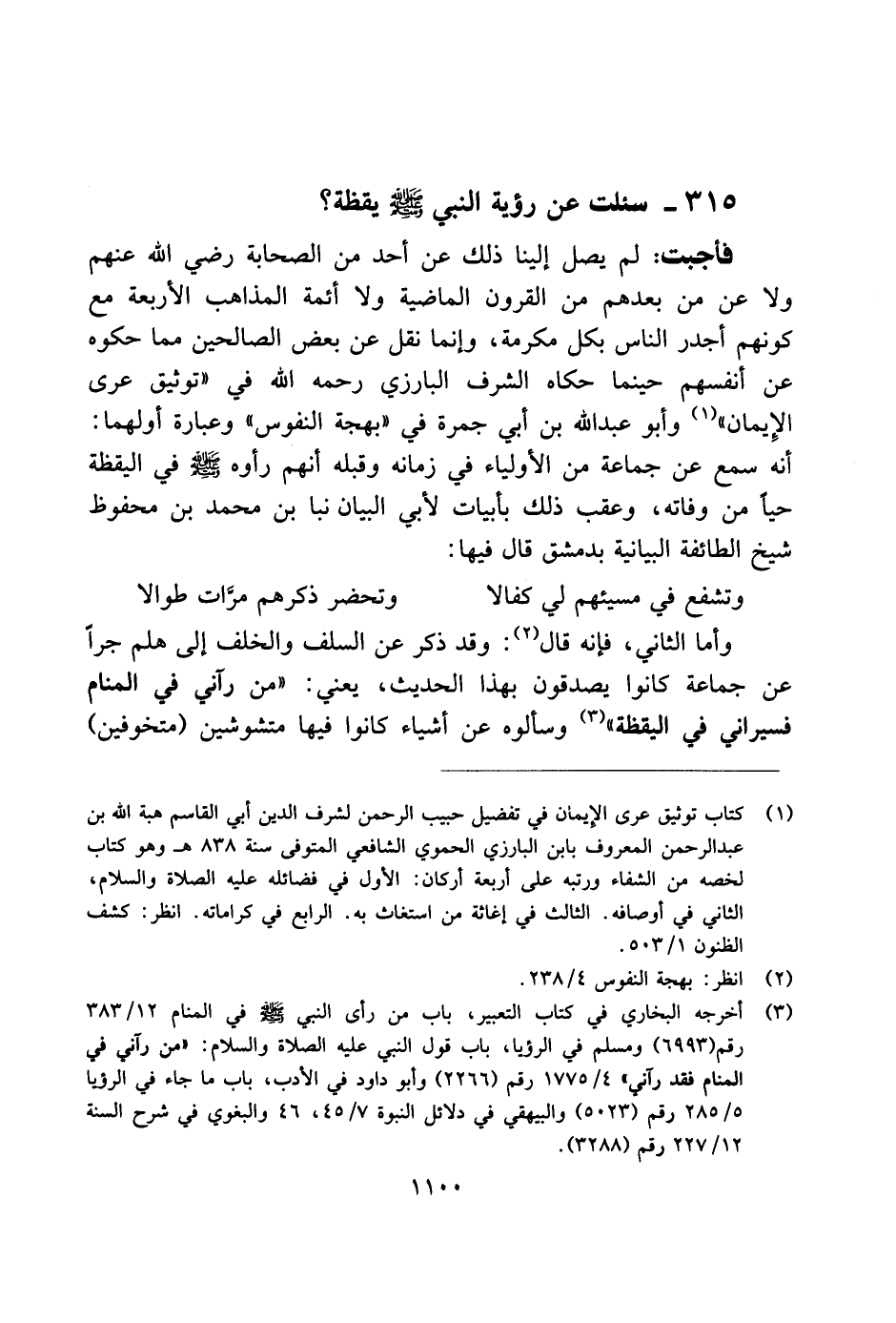 فأجبت: لم يصل إلينا ذلك عن أحد من الصحابة رضي الله عنهم ولا عن من بعدهم من القرون الماضية ولا أئمة المذاهب الأربعة مع كونهم أجدر الناس بكل مكرمة، وإنما نقل عن بعض الصالحين مما حكوه عن أنفسهم حينما حكاه الشرف البارزي رحمه الله في "توثيق عرى الإيمان" وأبو عبد الله بن أبي جمرة في "بهجة النفوس" وعبارة أولهما: أنه سمع عن جماعة من الأولياء في زمانه وقبله أنهم رأوه صلى الله عليه وسلم في اليقظة حيًا من وفاته، وعقب ذلك بأبيات لأبي البيان نبا بن محمد بن محفوظ شيخ الطائفة البيانية بدمشق قال فيها: