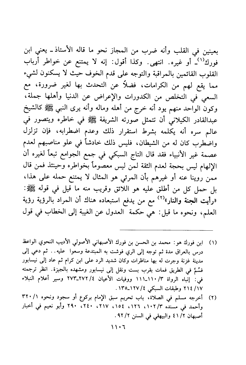 بعينين في القلب وأنه ضرب من المجاز نحو ما قاله الأستاذ ـ يعني ابن ورك ـ أو غيره. انتهى. وكذا أقول: إنه لا يمتنع عن خواطر أرباب القلوب القائمين بالمراقبة والتوجه على قدم الخوف حيث لا يسكنون لشيء مما يقع لهم من الكرامات، فضلاً عن التحدث بها لغير ضرورة، مع السعي في التخلص من الكدورات والإعراض عن الدنيا وأهلها جملة، وكون الواحد منهم يود أنه خرج من أهله وماله وأنه يرى النبي صلى الله عليه وسلم كالشيخ عبد القادر الكيلاني أن تتمثل صورته الشريفة صلى الله عليه وسلم في خاطره ويتصور في عالم سره أنه يكلمه بشرط استقرار ذلك وعدم اضطرابه، فإن تزلزل واضطرب كان له من الشيطان، فليس ذلك خادشًا في علو مناصبهم لعدم عصمة غير الأنبياء فقد قال التاج السبكي في جمع الجوامع تبعًا لغيره أن الإلهام ليس بحجة لعدم الثقة لمن ليس معصومًا بخواطره وحينئذ فمن قال ممن روينا عنه أو غيرهم بأن المرئي هو المثال لا يمتنع حمله على هذا، بل حمل كل من أطلق عليه هو اللائق وقريب منه ما قيل في قوله صلى الله عليه وسلم: "رأيت الجنة والنار" مع من يدفع استبعاده هناك أن المراد بالرؤية رؤية العلم، ونحوه ما قيل: هي حكمة العدول عن الغيبة إلى الخطاب في قول