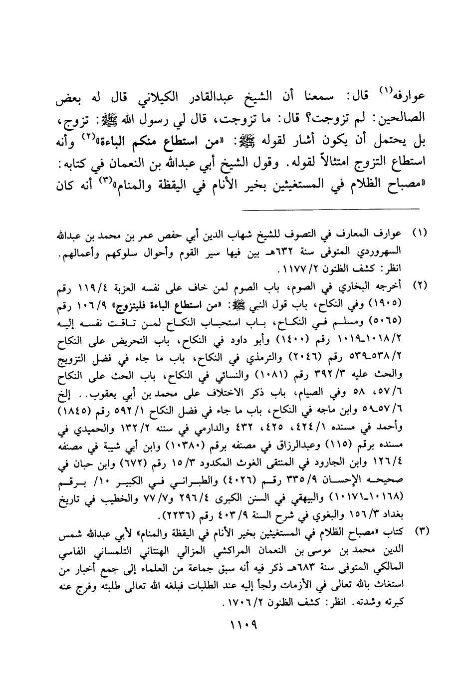 عوارفه قال: سمعنا أن الشيخ عبد القادر الكيلاني قال له بعض الصاحلين: لم تزوجت؟ قال: ما تزوجت، قال لي رسول الله صلى الله عليه وسلم: تزوج، بل يحتمل أن يكون أشار لقوله صلى الله عليه وسلم: "من استطاع منكم الباءة" وأنه استطاع التزوج امتثالاً لقوله. وقول الشيخ أبي عبد الله بن النعمان في كتابه: "مصباح الظلام في المستغيثين بخير الأنام في اليقظة والمنام" أنه كان
