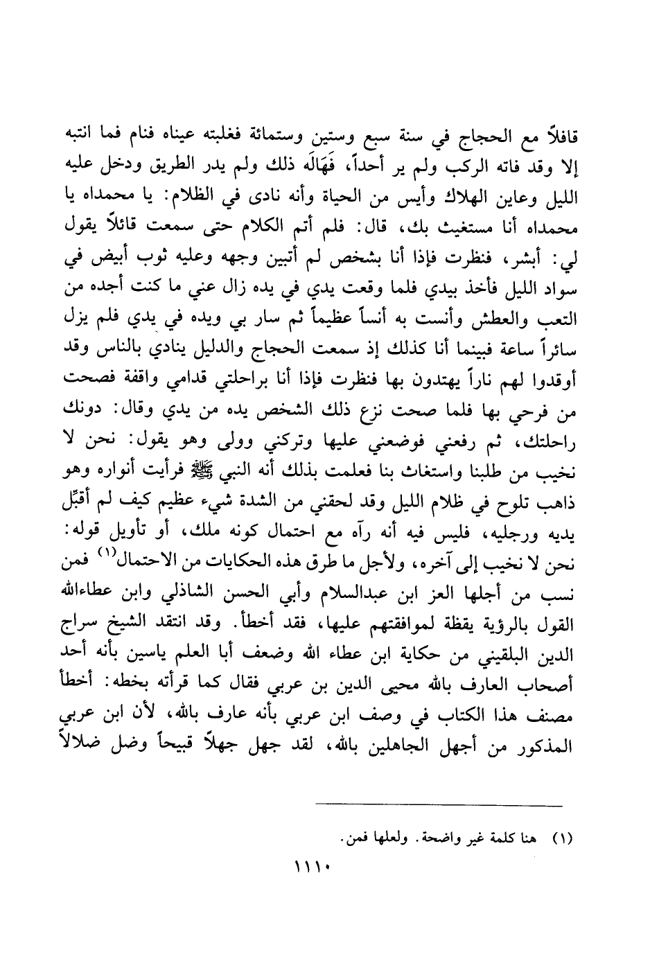 قافلاً مع الحجاج في سنة سبع وستين وستمائة فغلبته عيناه فنام فما انتبه إلا وقد فاته الركب ولم ير أحدًا، فَهَالَه ذلك ولم يدر الطريق ودخل عليه الليل وعاين الهلاك وأيس من الحياة وأنه نادى في الظلام: يا محمداه يا محمداه أنا مستغيث بك، قال: فلم أتم الكلام حتى سمعت قائلاً يقول لي: أبشر، فنظرت فإذا أنا بشخص لم أتبين وجهه وعليه ثوب أبيض في سواد الليل فأخذ بيدي فلما وقعت يدي في يده زال عني ما كنت أجده من التعب والعطش وأنست به أنسًا عظيمًا ثم سار بي ويده في يدي فلم يزل سائرًا ساعة فبينما أنا كذلك إذ سمعت الحجاج والدليل ينادي بالناس وقد أوقدوا لهم نارًا يهتدون بها فنظرت فغذا أنا براحلتي قدامي واقفة فصحت من فرحي بها فلما صحت نزع ذلك الشخص يده من يدي وقال: دونك راحلتك، ثم رفعني فوضعني عليها وتركني وولى وهو يقول: نحن لا نخيب من طلبنا واستغاث بنا فعلمت بذلك أنه النبي صلى الله عليه وسلم فرأيت أنواره وهو ذاهب تلوح في ظلام الليل وقد لحقني من الشدة شيء عظيم كيف لم أقبل يديه ورجليه، فليس فيه أنه رآه مع احتمال كونه ملك، أو تأويل قوله: نحن لان نخيب إلى آخره، ولأجل ما طرق هذه الحكايات من الاحتمال فمن نسب من أجلها العز ابن عبد السلام وأبى الحسن الشاذلي وابن عطاء الله القول بالرؤية يقظة لموافقتهم عليها، فقد أخطأ. وقد انتقد الشيخ سراج الدين البلقيني من حكاية ابن عطاء الله وضعف أبا العلم ياسين بأنه أحد اصحاب العارف بالله محيى الدين بن عربي فقال كما قرأته بخطه: أخطأ مصنف هذا الكتاب في وصف ابن عربي بأنه عارف بالله، لأن ابن عربي المذكور من أجهل الجاهلين بالله، لقد جهل جهلاً قبيحًا وضل ضلالاً