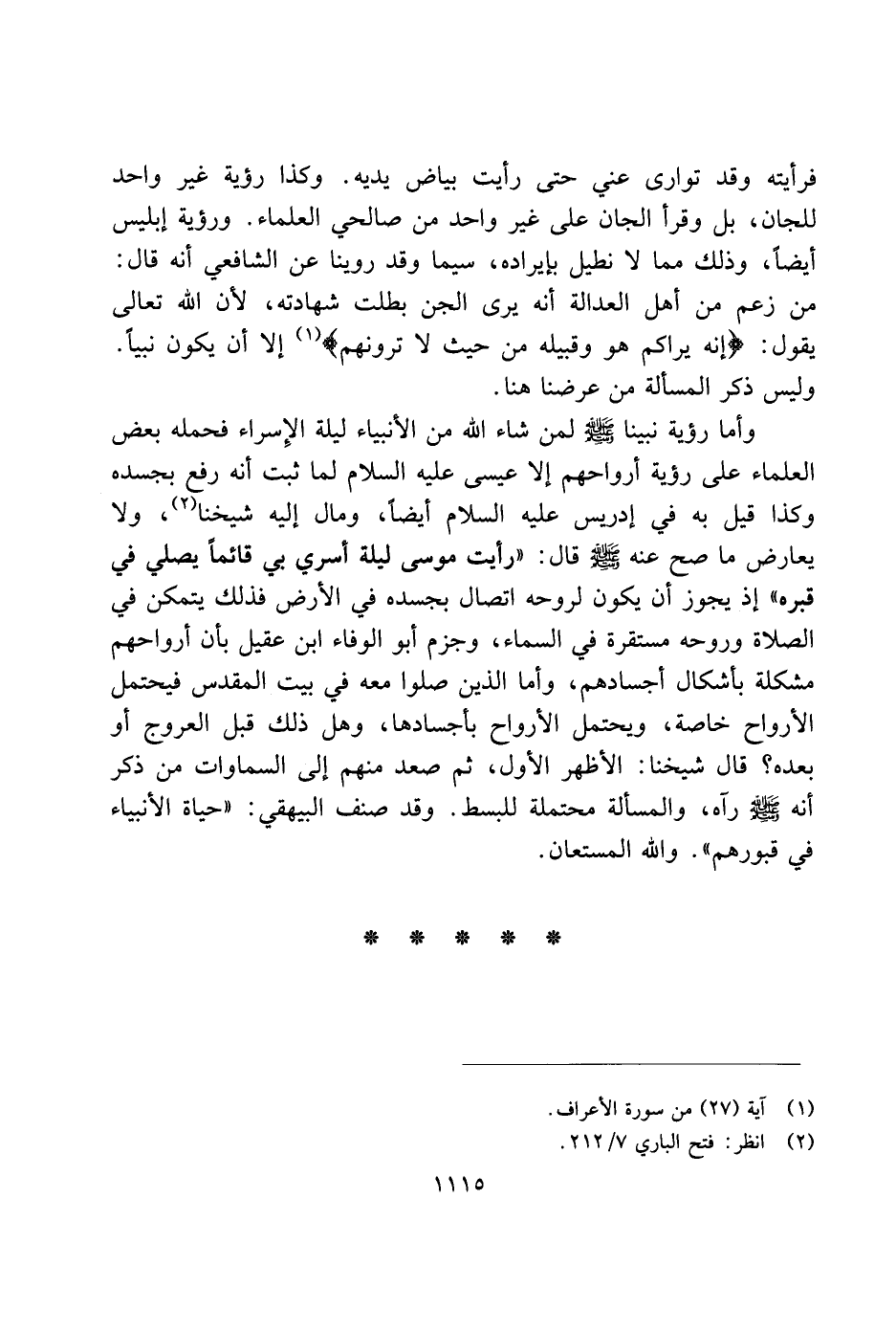 فرأيته وقد توارى عني حتى رأيت بياض يديه. وكذا رؤية غير واحد للجان، بل وقرأ الجان على غير واحد من صالحي العلماء. ورؤية إبليس أيضًا، وذلك مما لا نطيل بإيراده، سيما وقد روينا عن الشافعي أنه قال: من زعم من أهل العدالة أنه يرى الجن بطلت شهادته، لأن الله تعالى يقول: "إنه يراكم هو وقبيله من حيث لا ترونهم) إلا أن يكون نبيًا. وليس ذكر المسألة من عرضنا هنا.