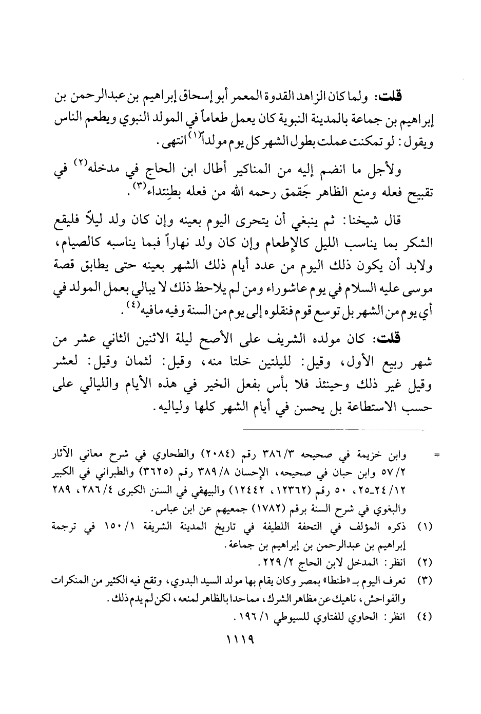 قلت: ولما كان الزاهد القدوة المعمر أبو إسحاق إبراهيم بن عبد الرحمن بن إبراهيم بن جماعة بالمدينة النبوية كان يعمل طعامًا في المولد النبوي ويطعم الناس ويقول: لو تمكنت عملت بطول الشهر كل يوم مولدًا انتهى.
