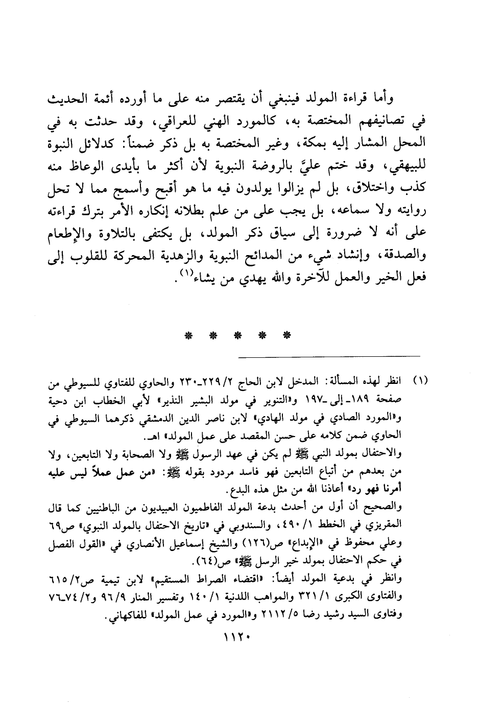 وأما قراءة المولد ينبغي أن يقتصر منه على ما أورده أئمة الحديث في تصانيفهم المختصة به، كالمورد الهني للعراقي، وقد حدثت به في المحل المشار إليه بمكة، وغير المختصة به بل ذكر ضمنًا: كدلائل النبوة للبيهقي، وقد ختم عليَّ بالروضة النبوية لأن أكثر ما بأيدي الوعاظ منه كذب واختلاف، بل لم يزالوا يولودون فيه ما هو أقبح وأسمج مما لا تحل روايته ولا سماعه، بل يجب على من علم بطلانه إنكاره الأمر بترك قراءته على أنه لا ضررة إلى سياق ذكر المولد، بل يكتفي بالتلاوة والإطعام والصدقة، وإنشاد شيء من المدائح النبوية والزهدية المحركة للقلوب إلى فعل الخير والعمل للآخرة والله يهدي من يشاء.