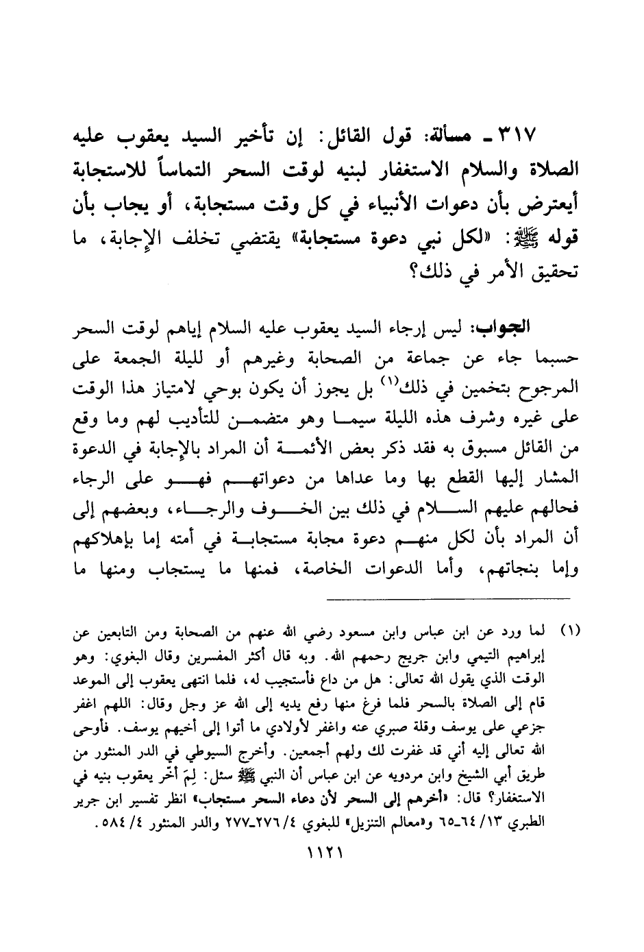 317 - مسألة: قول القائل: إن تأخير السيد يعقوب عليه الصلاة والسلام الاستغفار لبنيه لوقت السحر التماسًا للاستجابة أيعترض بأن دعوات الأنبياء في كل وقت مستجابة، أو يجاب بأن قوله صلى الله عليه وسلم: "لكل نبي دعوة مستجابة" يقتضى تخلف الإجابة، ما تحقيق الأمر في ذلك؟