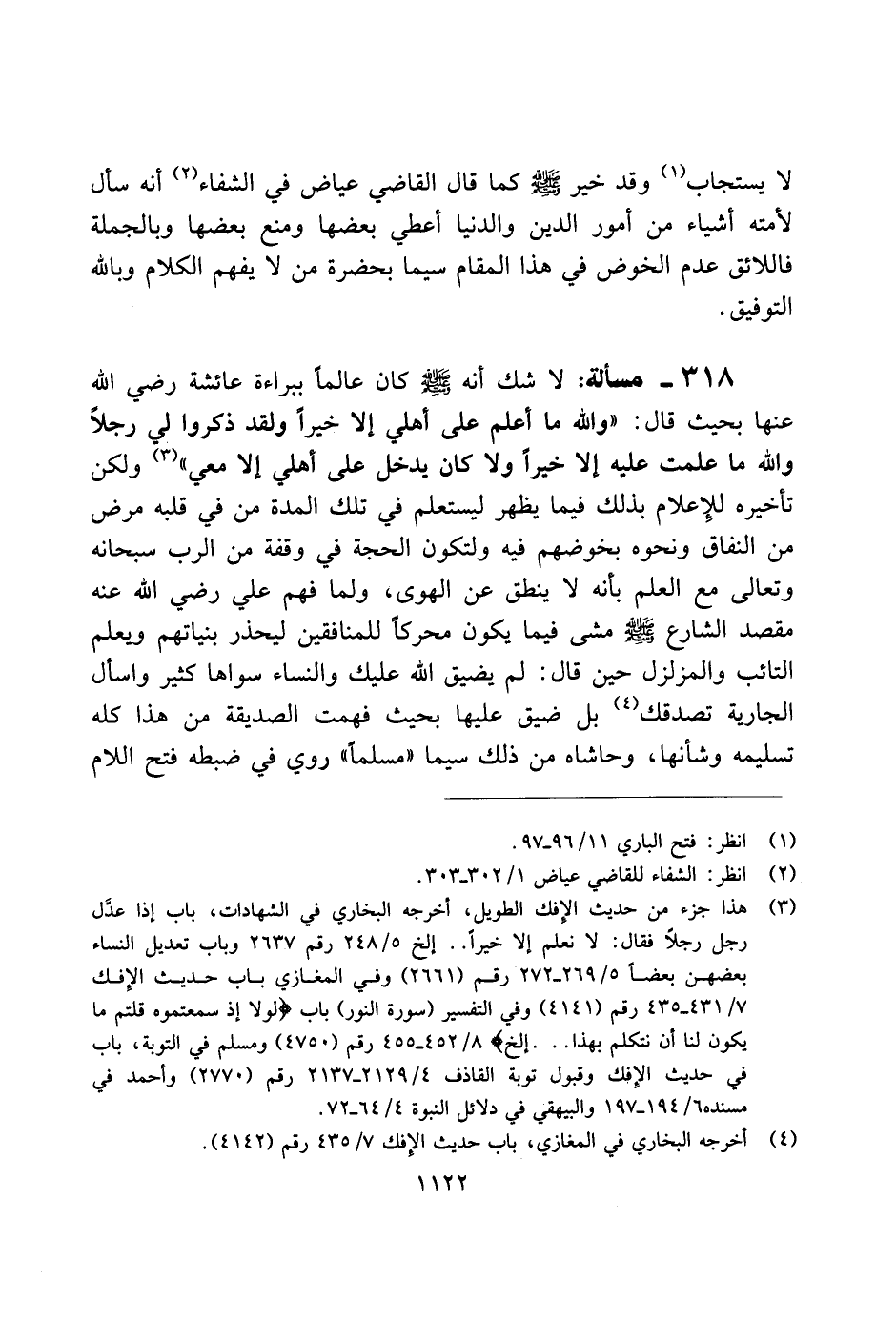 318 - مسألة: لا شك أنه صلى الله عليه وسلم كان عالمًا ببراءة عائشة رضي الله عنها بحيث قال: "والله ما أعلم على أهلي إلا خيرًا ولقد ذكروا لي رجلاً والله ما علمت عليه إلا خيرًا ولا كان يدخل على أهلي إلا معي" ولكن تأخيره للإعلام بذلك فيما يظهر ليستعلم في تلك المدة من في قلبه مرض من النفاق ونحوه بخضوهم فيه ولتكون الحجة ي وقفة من الرب سبحانه وتعالى مع العلم بأنه لا ينطق عن الهوى، ولما هم علي رضي الله عنه مقصد الشارع صلى الله عليه وسلم مشي فيما يكون محركًا للمنافقين ليحذر بنياتهم ويعلم التائب والمزلزل حين قال: لم يضيق الله عليك والنساء سواها كثير واسأل الجارية تصدقك بل ضيق عليها بحيث فهمت الصديقة من هذا كله تسليمه وشأنها، وحاشاه من ذلك سيما "مسلما" روي ضبطه فتح اللام