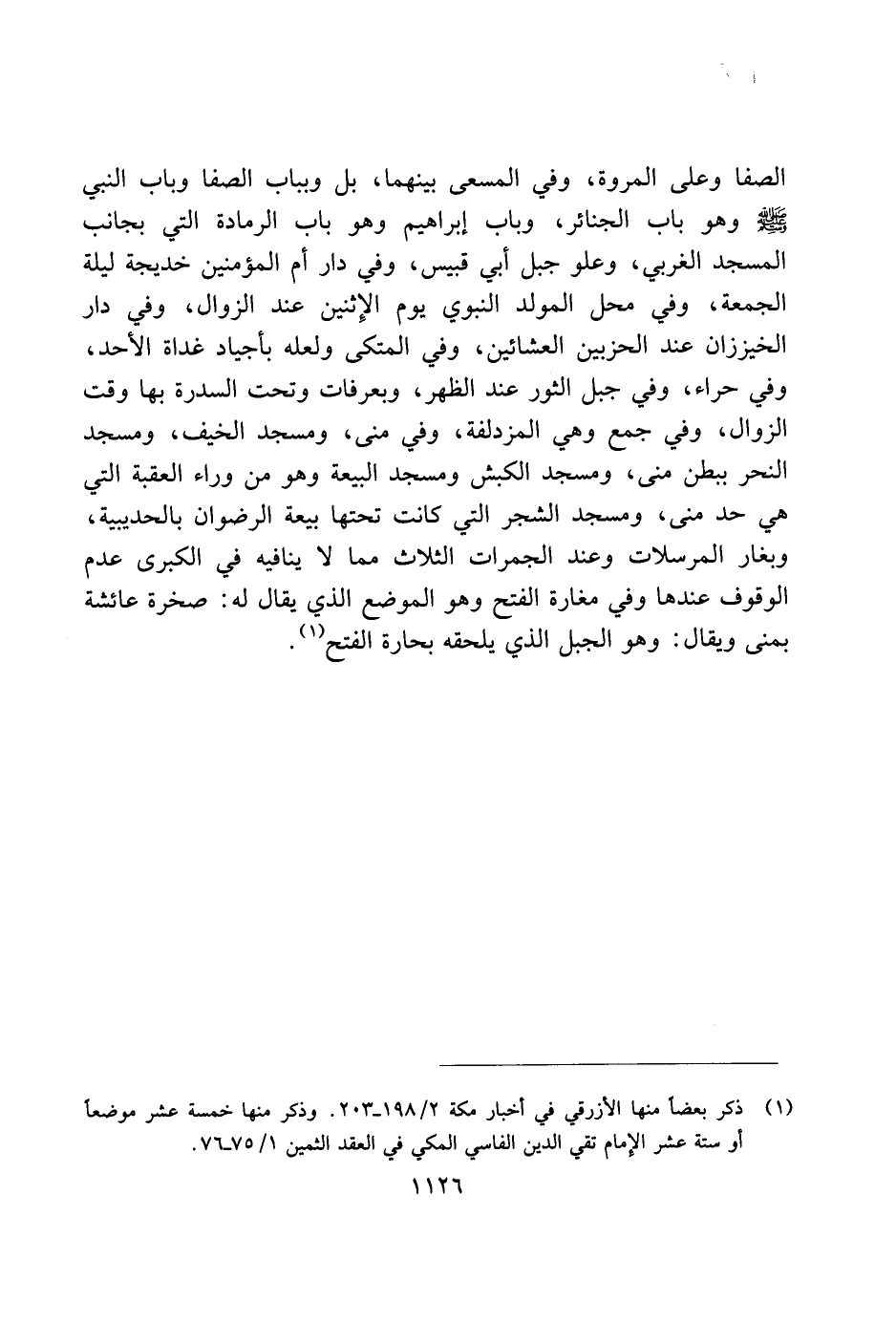 الصفا وعلى المروة، وفي المسعى بينهما، بل وبباب الصفا وباب النبي صلى الله عليه وسلم وهو باب الجنائز، وباب إبراهيم وهو باب الرمادة التي بجانب المسجد الغربي، وعلو جبل أبي قبيس، وفي دار أم المؤمنين خديجة ليلة الجمعة، وفي محل المولد النبوي يوم الإثنين عند الزوال، وفي دار الخيززان عند الحزبين العشائين، وفي المتكي ولعله بأجياد غداة الأحد، وفي حراء، وفي جبل الثور عند الظهر، وبعرفات وتحت السدرة بها وقت الزوال، وفي جمع وهي المزدلفة، وفي منى، ومسجد الخيف، ومسجد النحر ببطن منى، ومسجد الكبش ومسجد البيعة وهو من وراء العقبة التي هي حد منى، ومسجد الشجر التي كانت تحتها بيعة الرضوان بالحديبية، وبغار المرسلات وعند الجمرات الثلاث مما لا ينافيه في الكبرى عدم الوقوف عندها وفي مغارة الفتح وهو الموضع الذي يقال له: صخرة عائشة بمنى ويقال: وهو الجبل الذي يلحقه بحارة الفتح.