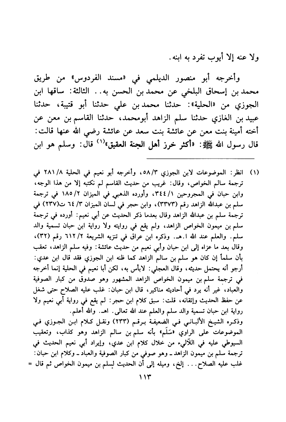 وأخرجه أبو منصور الديلمي في "مسند الفردوس" من طريق محمد بن إسحاق البلخي عن محمد بن الحسن به .. الثالثة: ساقها ابن الجوزي من "الحلية": حدثنا محمد بن علي حدثنا أبو قتيبة، حدثنا عبيد بن الغازي حدثنا سلم الزاهد أبو محمد، حدثنا القاسم بن معن عن أخته أمينة بنت معن عن عائشة بنت سعد عن عائشة رضي الله عنها قالت: قال رسول الله صلى الله عليه وسلم: "أكثر خرز أهل الجنة العقيق" قال: وسلم هو ابن
