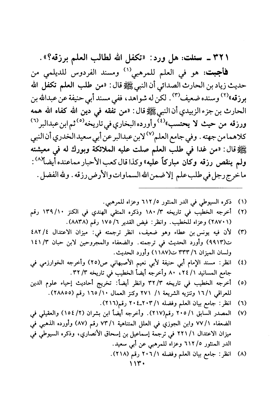فأجبت: هو في العلم للمرهبي ومسند الفردوس للديلمي من حديث زياد بن الحارث الصدائي أن النبي صلى الله عليه وسلم قال: "منطلب العلم تكفل الله برزقه" وسنده ضعيف. لكن له شواهد، ففي مسند أبي حنيفة عن عبد الله بن الحارث بن جزء الزبيدي أن النبي صلى الله عليه وسلم قال: "من تفقه في دين الله كفاه الله همه ورزقه من حيث لا يحتسب" وأورده البخاري في تاريخه ثم ابن عبد البر كلاهما من جهته. وفي جامع العلم لابن عبد البر عن أبي سعيد الخدري أن النبي صلى الله عليه وسلم قال: "من غدا في طلب العلم صلت عليه الملائكة وبورك له في معيشته ولم ينقص رزقه وكان مباركًا عليه" وكذا قال كعب الأحبار مما عنده أيضًا: ما خرج رجل في طلب علم إلا ضمن الله السماوات والأرض رزقه. ولله الفضل.