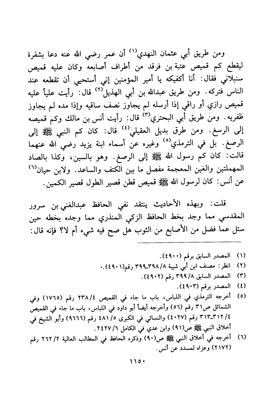 ومن طريق أبي عثمان النهدي أن عمر رضي الله عنه دعا بشفرة ليقع كم قميص عتبة بن فرقد من أطراف أصابعه وكان عليه قميص سنبلاني فقال: أنا أكفيكه يا أمير المؤمنين إني أتسحيي أن تقطعه عند الناس فتركه. ومن طريق عبد الله بن أبي الهذيل قال: رأيت عليًا عليه قميص رازي أو راقي إذا أرسله لم يجاوز نصف ساقيه وإذا مده لم يجاوز ظفريه. ومن طريق أبي البحتري قال: رأيت أنس بن مالك وكم قميصه إلى الرسغ. ومن طرق بديل العقيلي قال: كان كم النبي صلى الله عليه وسلم إلى الرصغ. بل في الترمذي وغيره عن أسماء ابنة يزيد رضي الله عنهما قالت: كان كم رسول الله صلى الله عليه وسلم إلى الرصغ. وهو بالسين، وكذا بالصاد المهملتين والغين والمعجمة مفصل ما بين الكتف والساعد. ولابن حيان عن أنس: كان لرسول الله صلى الله عليه وسلم قميص قطن قصير الطول قصير الكمين.