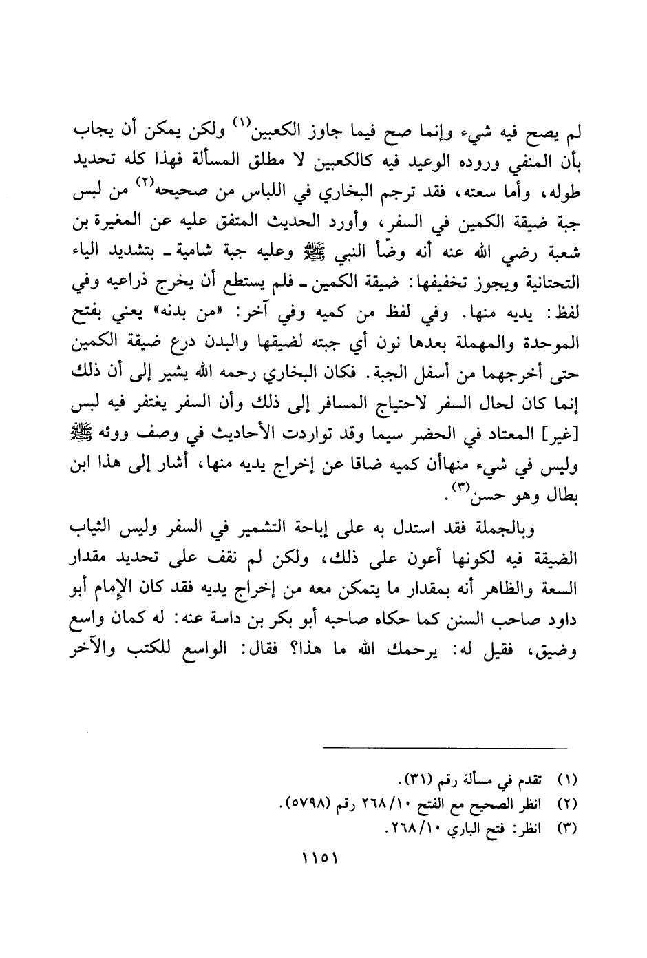 لم يصح فيه شيء وإنما صح فيما جاوز الكعبين ولكن يمكن أن يجاب بأن المنفي وروده الوعيد فيه كالكعبين لا مطلق المسألة فهذا كله تحديد طوله، وأما سعته، فقد ترجم البخاري في اللباس من صحيحه من لبس جبة ضيقة الكمين في السفر، وأورد الحديث المتفق عليه عن المغيرة بن شعبة رضي الله عنه أنه وضأ النبي صلى الله عليه وسلم وعليه جبة شامية ـ بتشديد الياء التحتانية ويجوز تخفيفها: ضيقة الكمين ـ فلم يستطيع أن يخرج ذراعيه وفي لفظ: يديه منها. وفي لفظ من كميه وفي آخر: "من بدنه" يعني بفتح الموحدة والمهملة بعدها نون أي جبته لضيقها والبدن درع ضيقة الكمين حتى أخرجهما من أسفل الجبة. فكان البخاري رحمه الله يشير إلى أن ذلك إنما كان لحال السفر لاحتياج المسافر إلى ذلك وأن السفر يغتفر فيه لبس [غير] المعتاد في الحضر سيما وقد تواردت الأحاديث في وصف ووئه صلى الله عليه وسلم وليس في شيء منها أن كمية ضاقا عن إخراج يديه منها، أشار إلى هذا ابن بطال وهو حسن.
