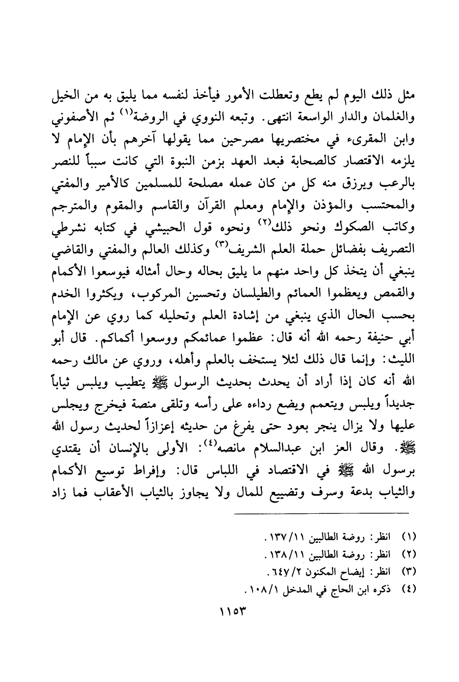 مثل ذلك اليوم لم يطع وتعطلت الأمور فيأخذ لنسه مما يليق به من الخيل والغلمان والدار الواسعة انتهى. وتبعه النووي في الروضة ثم الأصفوني وابن القرئ في مختصريها مصرحين مما يقولها آخرهم بأن الإمام لا يلزمه الاقتصار كالصحابة فبعد العهد بزمن النبوة التي كانت سببًا للنصر بالرعب ويرزق منه كل من كان عمله مصلحة للمسلمين كالأمير والمفتي والمحتسب والمؤذن والإمام ومعلم القرآن والقاسم والمقوم والمترجم وكاتب الصحكوك ونحو ذلك ونحوه قول الحبيشي في كتابه نشرطي التصريف بفضائل حملة العلم الشريف وكذلك العالم والمفتي والقاضي ينبغي أن يتخذ كل واحد منهم ما يليق بحاله وحال أمثاله فيوسعوا الأكمام والقمص ويعظموا العمائم والطيلسان وتحسين المركوب، ويكثروا الخدم بحسب الحال الذي ينبغي من إشادة العلم وتحليله كما روي عن الإمام أي حنيفة رحمه الله أنه قال: عظموا عمائمكم ووسعوا أكماكم. قال أبو الليث: وإنما قال ذلك لئلا يستخف بالعلم وأهله، وروي عن مالك رحمه الله أنه كان إذا أراد أن يحدث بحديث الرسول صلى الله عليه وسلم يتطيب ويلبس ثيابًا جديدًا ويلبس ويتعمم ويضع رداءه على رأسه وتلقى منصة فيخرج ويجلس عليها ولا يزال ينجر بعود حتى يفرغ م حديثه إعزازًا لحديث رسول الله صلى الله عليه وسلم. وقال العز ابن عبد السلام ما نصه. الأولى بالإنسان أن يقتدي برسول الله صلى الله عليه وسلم في الاقتصاد في اللباس قال: وإفراط توسيع الأكمام واثياب بدعة وسوف وتضييع للمال ولا يجاوز بالثياب الأعقاب فما زاد