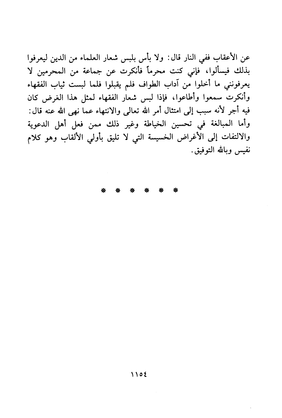 عن الأعقاب ففي النار قال: ولا بأس بلبس شعار العلماء من الدين ليعرفوا بذلك فيسألوا، فإني كنت محرمًا فأنكرت عن جماعة من المحرمين لا يعرفونني ما أخلوا من آداب الطواف فلم يقبلوا فلما لبست ثياب الفقهاء وأنكرت سمعوا وأطاعوا، فإذا لبس شعار الفقهاء لمثل هذا الغرض كان فيه أجر لأنه سبب إلى امتثال أمر الله تعالى والانتهاء عما نهى الله عنه قال: وأما المبالغة في تحسين الخياطة وغير ذلك ممن فعل أهل الدعوية والالتفات إلى الأغراض الخسيسة التي لا تليق بأولي الألقاب وهو كلام نفيس وبالله التوفيق.