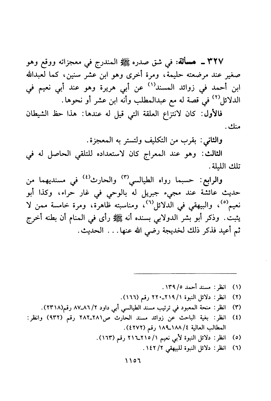 327 - مسألة: في شق صدره صلى الله عليه وسلم المندرج في معجزاته ووقع وهو صغير عند مرضعته حليمة، ومرة أخرى وهو ابن عشر سنين، كما لعبد الله ابن أحمد في زوائد المسند عن أبي هريرة وهو عند أبي نعيم في الدلائل في قصة له مع عبد المطلب وأنه ابن عشر أو نحوها.