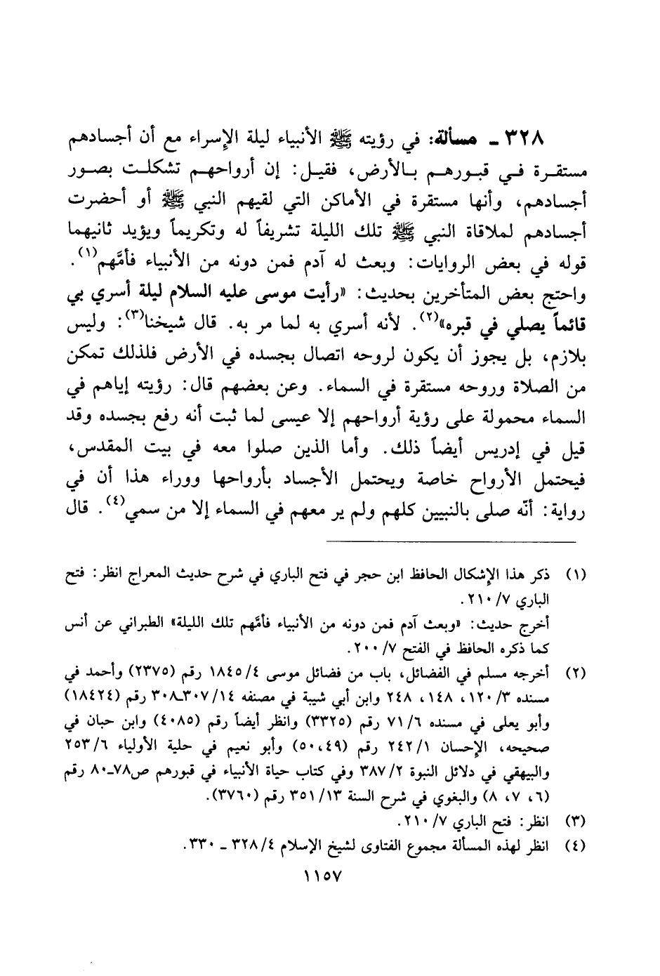 328 - مسألة: في رؤيته صلى الله عليه وسلم الأنبياء ليلة الإسراء مع أن أجسادهم مستقرة في قبورهم بالأرض، فقيل: إن أرواحهم تشكلت بصور أجسادهم، وأنها مستقرة في الأماكن التي لقيهم النبي صلى الله عليه وسلم أو أحضرت أجسادهم لملاقاة النبي صلى الله عليه وسلم تلك الليلة تشريفًا له وتكريمًا ويؤيد ثانيهما قوله في بعض الروايات: وبعث له آدم فمن دونه من الأنبياء فأمهم. واحتج بعض المتأخرين بحديث: "رأيت موسى عليه السلام ليلة أسري بي قائمًا يصلي في قبره". لأنه أسرى به لما مر به. قال شيخنا: وليس بلازم، بل يجوز أن يكون لروحه اتصال بجسده في الأرض فلذلك تمكن من الصلاة وروحه مستقرة في السماء. وعن بعضهم قال: رؤيته إياهم في السماء محمولة على رؤية أرواحهم إلا عيسى لما ثبت أنه رفع بجسده وقد قيل في إدريس أيضًا ذلك. وأما الذين صلوا معه في بيت المقدس، فيحتمل الأرواح خاصة ويحتمل الأجساد بأرواحها ووراء هذا أن في رواية: أنه صلى بالنبيين كلهم ولم ير معهم في السماء إلا من سمي. قال