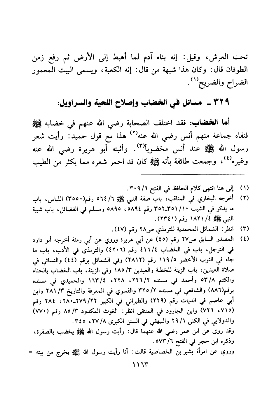 أما الخطاب: فقد اختلف الصحابة رضي الله عنهم في خضابه صلى الله عليه وسلم فنفاه جماعة منهم أنس رضي الله عنه هذا مع قول حميد: رأيت شعر رسول الله صلى الله عليه وسلم عند أنس مخضوبًا. وأثبته أبو هريرة رضي الله عنه وغيره، وجمعت طائفة بأنه صلى الله عليه وسلم كان قد احمر شعره مما يكثر من الطيب