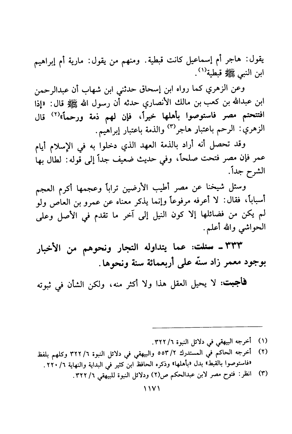 وعن الزهري كما رواه ابن إسحاق حدثني ابن شهاب أن عبد الرحمن ابن عبد الله بن كعب بن مالك الأنصاري حدثه أن رسول الله صلى الله عليه وسلم قال: "إذا افتتحتم مصر فاستوصوا بأهلها خيرًا، فإن لهم ذمة ورحمًا" قال الزهري: الرحم باعتبار هاجر والذمة باعتبار إبراهيم.