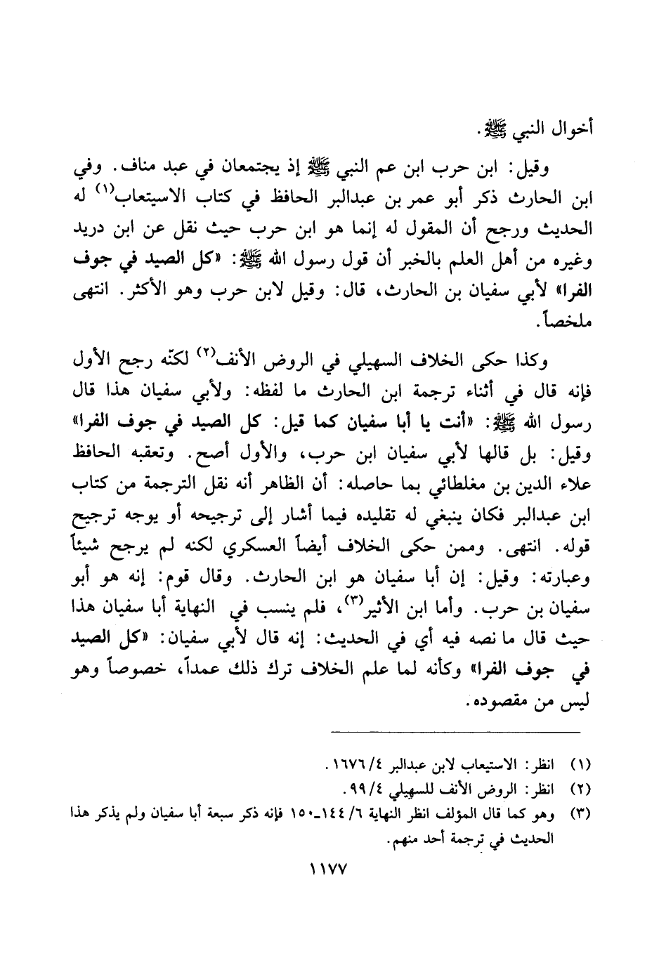 وقيل: ابن حرب ابن عم النبي صلى الله عليه وسلم إذ يجتمعان في عبد مناف. وفي ابن الحارث ذكر أبو عمربن عبد البر الحافظ في كتاب الاستيعاب له الحديث ورجع أن المقول له إنما هو ابن حرب حيث نقل عن ابن دريد وغيره من أهل العلم بالخبر أن قول رسول الله صلى الله عليه وسلم: "كل الصيد في جوف الفرا" لأبي سفيان بن الحارث، قال: وقيل لابن حرب وهو الأكثر. انتهى مخلصًا.