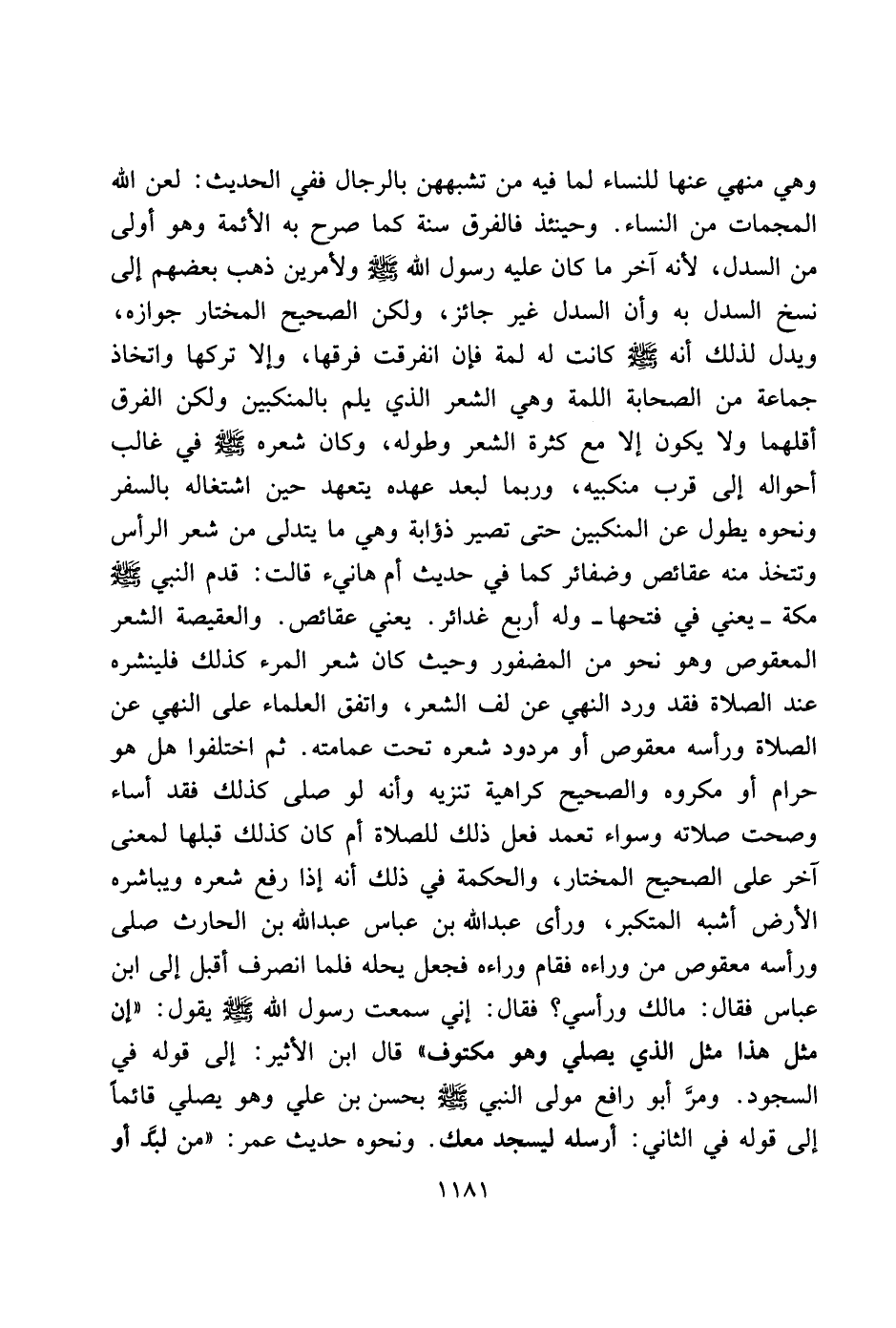 وهي منهي عنها للنساء لما فيه من تشبههن بالرجال ففي الحديث: لعن الله المجمعات من النساء. وحينئذ فالفرق سنة كما صحر به الأئمة وهو أولى من السدل، لأنه آخر ما كان عليه رسول الله صلى الله عليه وسلم ولأمرين ذهب بعضهم إلى نسخ السدل به وأن السدل غير جائز، ولكن الصحيح المختار جوازه، ويدل لذلك أنه صلى الله عليه وسلم كانت له لمة فإن انفرقت فرقها، وإلا تركها واتخاذ جماعة من الصحابة اللمة وهي الشعر الذي يلم بالمنكبين ولكن الفرق أقلهما ولا يكون إلا مع كثرة الشعر وطوله، وكان شعره صلى الله عليه وسلم في غالب أحواله إلى قرب منكبيه، وربا لبعد عهده يتعهد حين اشتغاله بالسفر ونحوه يطول عن المنكبين حتى تصير ذؤابة وهي ما يتدلى من شعر الرأس وتتخذ منه عقائص وضفار كما في حديث أم هانيء قالت: قدم النبي صلى الله عليه وسلم مكة ـ يعني في فتحها ـ وله أربع غدائر. يعني عقائص. والعقيصة الشعر المعقوص وهو نحو من المضفور وحيث كان شعر المرء كذلك فلينشره عند الصلاة فقد ورد النهي عن لف الشعر، واتفق العلماء على النهي عن الصلاة ورأسه معقوص أو مردود شعره تحت عمامته. ثم اختلفوا هل هو حرام أو مكروه والصحيح كراهية تنزيه وأنه لو صلى كذلك فقد أساء وصحت صلاته وسواء تعمد فعل ذلك للصلاة أم كان كذلك قبلها لمعنى آخر على الصحيح المختار، والحكمة في ذلك أنه إذا رفع شعره ويباشره الأرض أشبه المتكبر، ورأى عبد الله بن عباس عبد الله بن الحارث صلى ورأسه معقوص من رواءه فقام وراءه فجعل يحله فلما انصرف أقبل إلى ابن عباس فقال: مالك ورأسي؟ فقال: إني سمعت رسول الله صلى الله عليه وسلم يقول: "إن مثل هذا مثل الذي يصلي وهو مكتوف" قال ابن الأثير: إلى قوله في السجود. ومر أبو رافع مولى النبي صلى الله عليه وسلم بحسن بن علي وهو يصلي قائمًا إلى قوله في الثاني: أرسله ليسجد معك. ونحوه حديث عمر: "من لبد أو