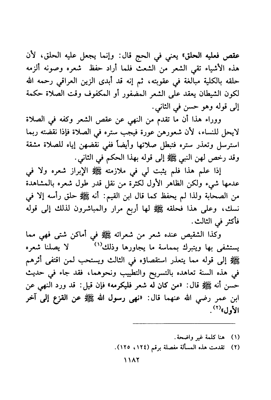 عقص فعليه الحلق"يعني في الحج قال: وإنما يجعل عليه الحلق، ولأن هذه اأشياءتقي الشعر من الشعث فلما أراد حفظ شعره وصونه ألزمه حلقه بالكلية مبالغة في عقوبته، ثم إنه قد أبدى الزين العراقي رحمه الله لكون الشيطان يعقد على الشعر المضفور أو المكفوف وقت الصلاة حكمة إى قوله وهو حسن في الثاني.