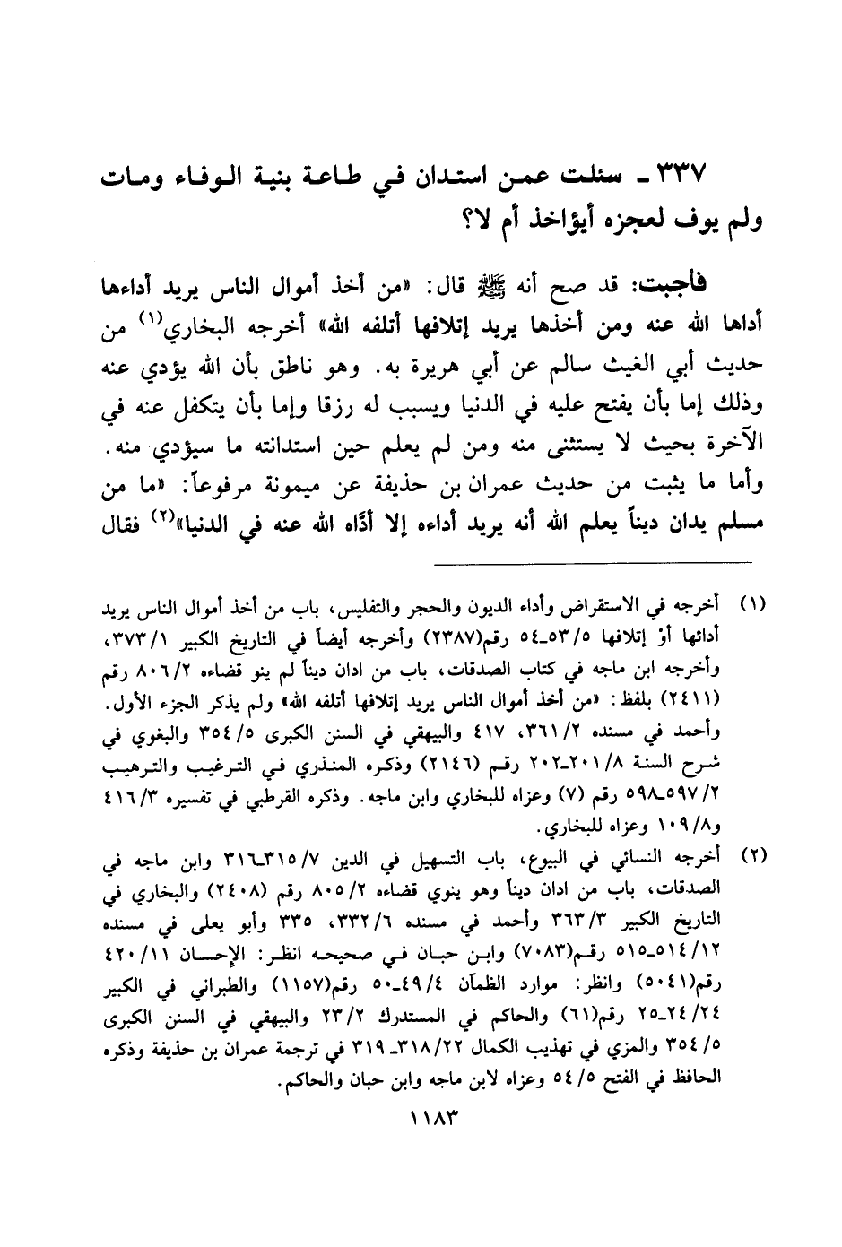 337 - سئلت عمن استدان في طاعة بنية الوفاء ومات ولم يوف لعجزه أيؤخذ أم لا؟