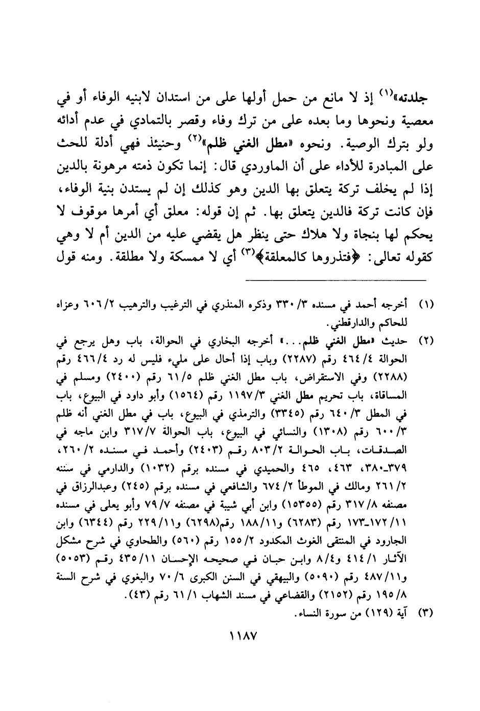 جلدته إذ لا مانع من حمل أولها على من استدان لابنيه الوفاء أو في معصية ونحوها وما بعده على من ترك وفاء وقصر بالتمادي في عدم أدائه ولو بترك الوصية. ونحوه "مطل الغنى ظلم" وحينئذ فهي أدلة للحث على المبادرة للأداء على أن الماوردي قال: إنما تكون ذمته مرهونة بالدين إذا لم يخلف تركة يتعلق بها الدين وهو كذلك إن لم يستدن بنية الوفاء، فإن كانت تركة فالدين يتعلق بها. ثم إن قوله: معلق أي أمرها موقوف لا يحكم لها بنجاة ولا هلاك حتى ينظر هل يقضي عليه من الدين أم لا وهي كقوله تعالى: (فتذروها كالمعلقة) أي لا ممسكة ولامطلقة. ومنه قول