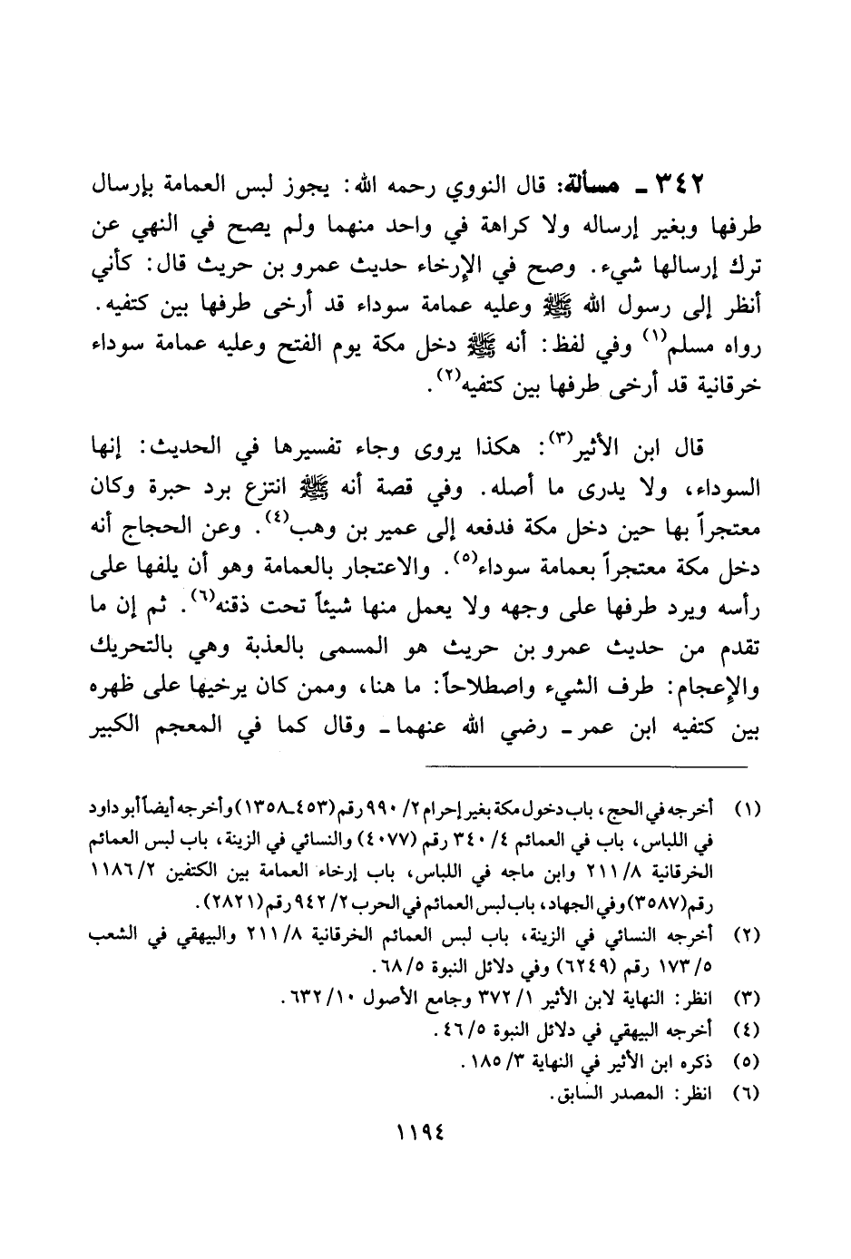 342 - مسألة: قال النووي رحمه الله: يجوز لبس العمامة بإرسال طرفه وبغير إرساله ولا كراهة في واحد منهما ولم يصح في النهي عن ترك إرسالها شيء. وصح في الإرخاء حديث عمرو بن حريث قال: كأني أنظر إلى رسول الله صلى الله عليه وسلم وعليه عمامة سوداء قد أرخى طرفها بين كتفيه. رواه مسلم وفي لفظ: أنه صلى الله عليه وسلم دخل مكة يوم الفتح وعليه عمامة سوداء خرقانية قد أخرى طرفها بين كتفيه.