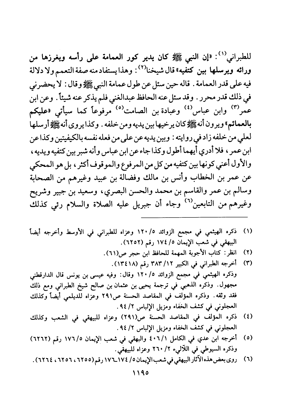 للطبراني: "إن النبي صلى الله عليه وسلم كان يدير كور العمامة على رأسه ويغرزها من ورائه ويرسلها بين كتفيه" قال شيخنا: وهذا يستفاد منه صفة التعميم ولا دلالة فيه على قدر العمامة. قاله حين سئل عن طولعمامة النبي صلى الله عليه وسلم وقال: لا يحضرني في ذلك قدر محرر. وقد سئل عنه الحافظ عبد الغني فلم يذكر عنه شيئًا. وعن ابن عمر وابن عباس وعبادة بن الصامت مرفوعًا كما سيأتي "عليكم بالعمائم" ويرون أنه صلى الله عليه وسلم كان يرخيها بين يديه ومن خلفه. وكذا يروى أنه صلى الله عليه وسلم أرسلها لعلي من خلفه زاد في روايته: وبين يديه عن على من فعله نفسه بالكيفيتين وكذا عن ابن عمر، فلا أدري أيهما أطول وكذا جاء عن ابن عباس وأنه شبر بين كتفيه ويديه، والأول أعني كونها بين كتفيه من كل من المرفوع والموقوف أكثر، بل هو المحكي عن عمر بن الخطاب وأنس بن مالك وفضالة بن عبيد وغيرهم من الصحابة وسالم بن عمر والقاسم بن محمد والحسن البصري، وسعيد بن جبير وشريح وغيرهم من التابعين وجاء أن جبريل عليه الصلاة والسلام رئي كذلك