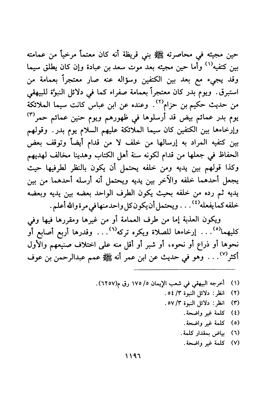 حين مجيئه في محاصرته صلى الله عليه وسلم بني قريظة أنه كان معتمًا مرخيًا من عمامته بين كتفيه وأما حين مجيئه بعد موت سعد بن عبادة وإن كان يطلق سيما وقد يجيء مع بعد بين الكتفين وسؤاله عنه صار متعجزًأ بعمامة من استبرق. ويوم بدر كان متعجرًا بعمامة صفراء كما في دلائل النبوة للبيهقي من حديث حكيم بن حزام. وعنده عن ابن عباس كانت سيما الملائكة يوم بدر عمائم بيض قد أرسلوها في ظهورهم ويوم حنين عمائم حمر وإرخاءها بين الكتفين كان سيما الملائكة عليهم السلام يوم بدر. وقولهم بين كتفيه المراد به إرسالها من خلف لا من قدام أيضًا وتوقف بعض الحفاظ في جعلها من قدام لكونه سنة أهل الكتاب وهدينا مخالف لهديهم وكذا قولهم بين يديه ومن خلفه يحتمل أن يكون بالنظر لطرفيها حيث يجعل أحدهما خلفه والآخر بين يديه ويحتمل أنه أرسله أحدهما من بين يديه ثم رده من خلفه بحيث يكون الطرف الواحد بعضه بين يديه وبعضه خلفه كما يفعله ... ويحتمل أن يكون كل واحد منها في مرة والله أعلم.