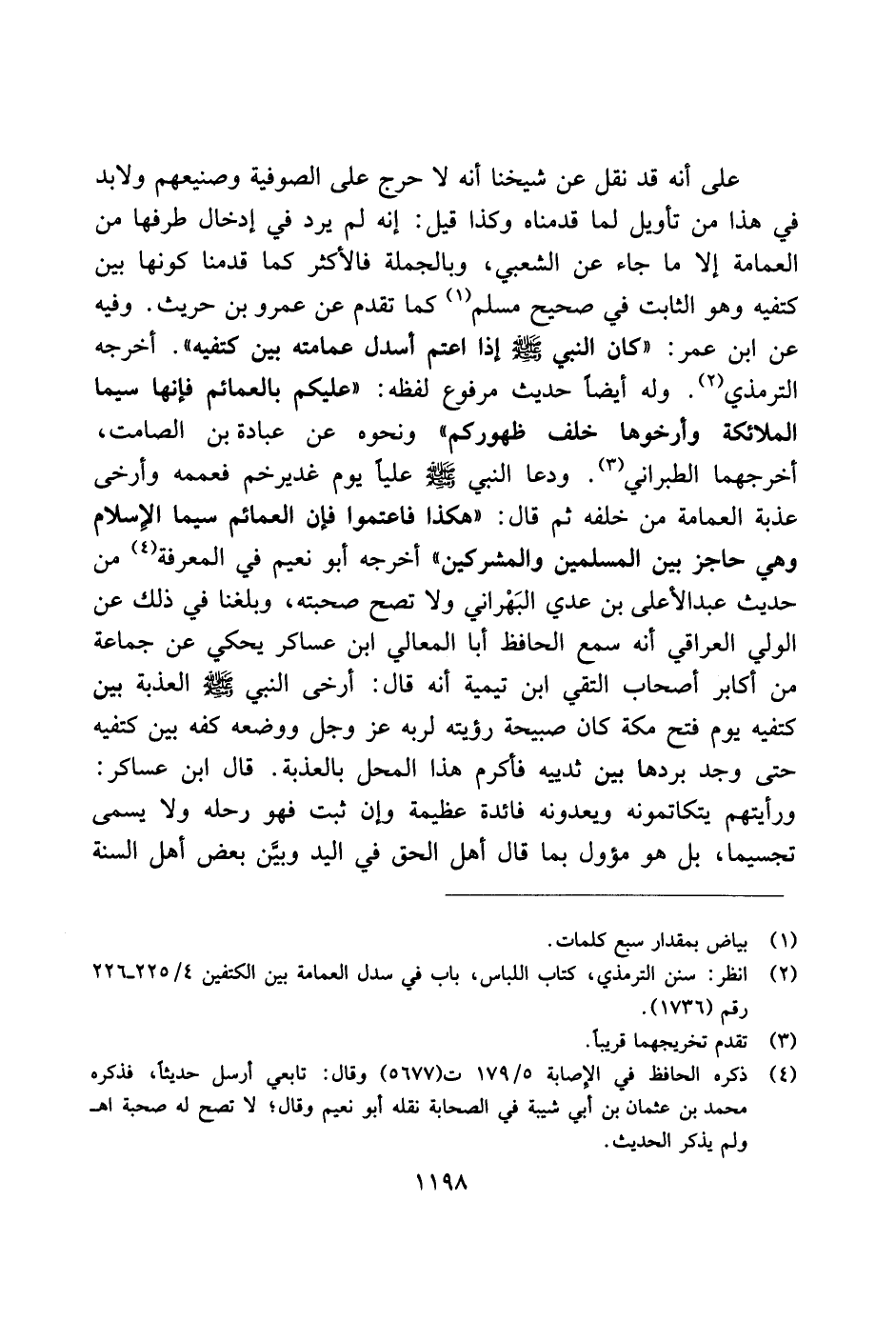 على أنه قد نقل عن شيخنا أنه لا حرج على الصوفية وصنيعهم ولابد في هذا من تأويل لما قدمناه وكذا قيل: إنه لم يرد في إدخال طرفها من العمامة إلا ما جاء عن الشعبي، وبالجملة فالأكثر كما قدمنا كونها بين كتفيه وهو الثابت في صحيح مسلم كما تقدم عن عمرو بن حريث. وفيه عن ابن عمر: "كان النبي صلى الله عليه وسلم إذا اعتم أسدل عمامته بين كتفيه". أخرجه الترمذي. وله أيضًا حديث مرفوع لفظه: "عليكم بالعمائم فإنها سيما الملائكة وأرخوها خلف ظهوركم" ونحوه عن عبادة بن الصامت، أخرجهما الطبراني. ودعا النبي صلى الله عليه وسلم عليًا يوم غديرخم فعممه وأرخى عذبة العمامة من خلفه ثم قال: "هكذا فاعتموا فإن العمائم سيما الإسلام وهي حاجز بين المسلمين والمشركين" أخرجه أبو نعيم في المعرفة من حديث عبد الأعلى بن عدي البهراني ولا تصح صحبته، وبلغنا في ذلك عن الولي العراقي أنه سمع الحافظ أبا المعالي ابن عساكر يحكي عن جماعة من أكابر أصحاب التقي ابن تيمية أنه قال: أخرى النبي صلى الله عليه وسلم العذبة بين كتفيه يوم فتح مكة كان صبيحة رؤيته لربه عز وجل ووضعه كفه بين كتفيه حتى وجد بردها بين ثدييه فأكرم هذا المحل بالعذبة. قال ابن عساكر: ورأيتهم يتكاتمونه ويعدونه فائدة عظيمة وإن ثبت فهو رحله ولا يسمى تجسيمًا، بل هو مؤول بما قال أهل الحق في اليد وبين بعض أهل السنة